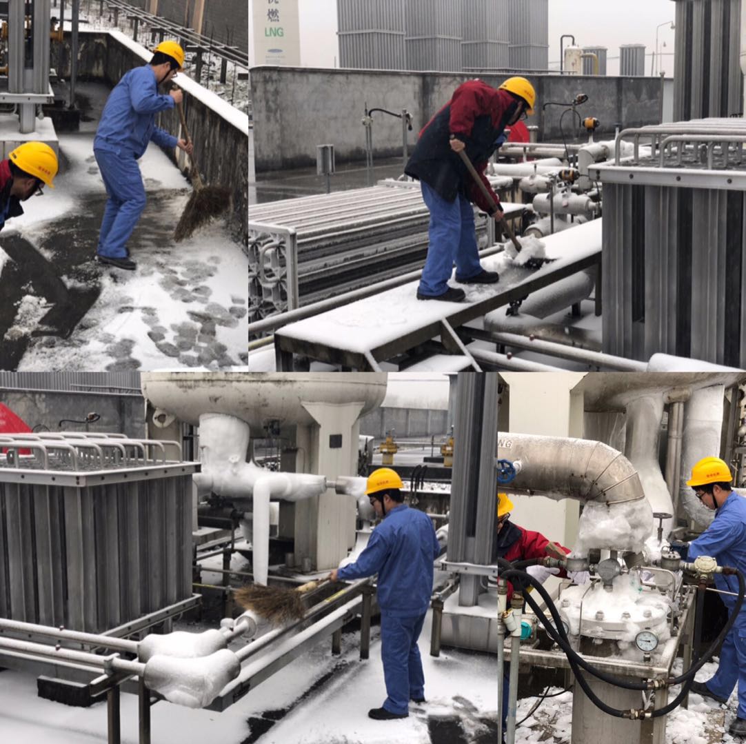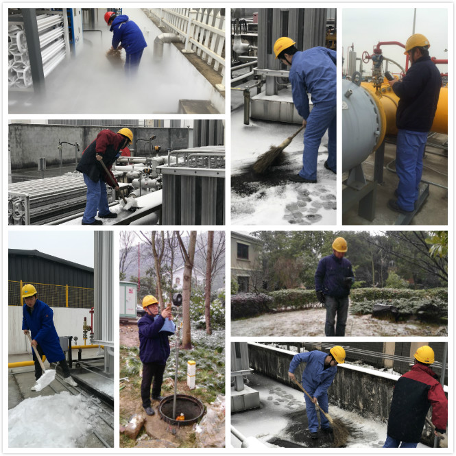 25日早上6点30分,劳模沈卫国就赶到单位,利用压力远传系统对每台调压器的运行状况进行全面了解。确认无异常情况后又带领调压班员工对蔡马人家、钱塘大厦、财税局、省委党校等处的燃气调压器进行排水排污,预防结冻影响用户用气;8点,分公司领导们拿起扫帚,与到岗员工一起清除路面和抢修运行车辆上的积雪。