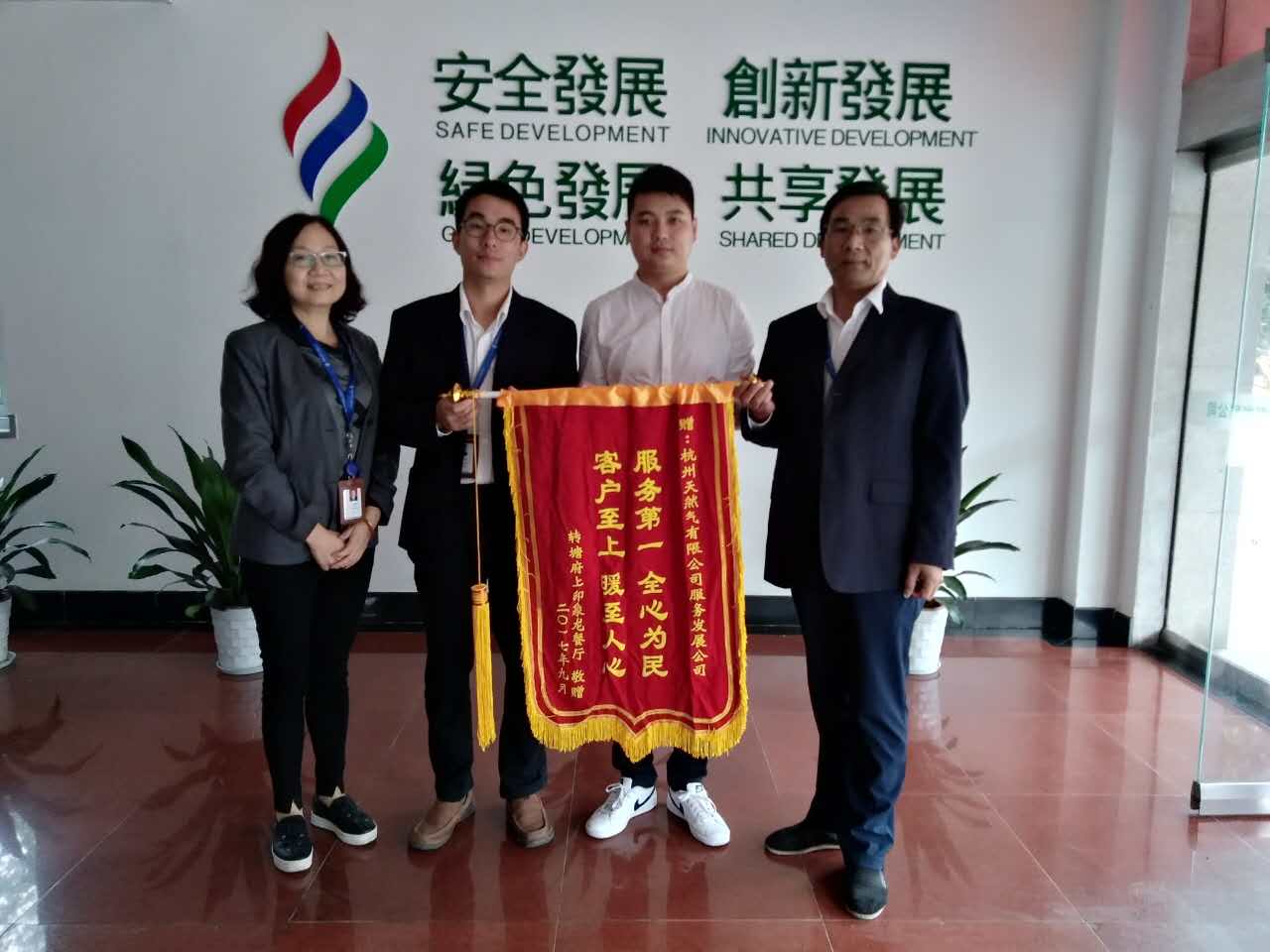 10月13日上午,杭州凡依餐饮有限公司耿先生特地将一面写有“服务第一,全心为民,客户至上,暖至人心”的锦旗送至杭天公司,真诚感谢公司在拆改工作中提供的优质服务,对项目经理项凯迪高效仔细的工作作风更是连连称赞。