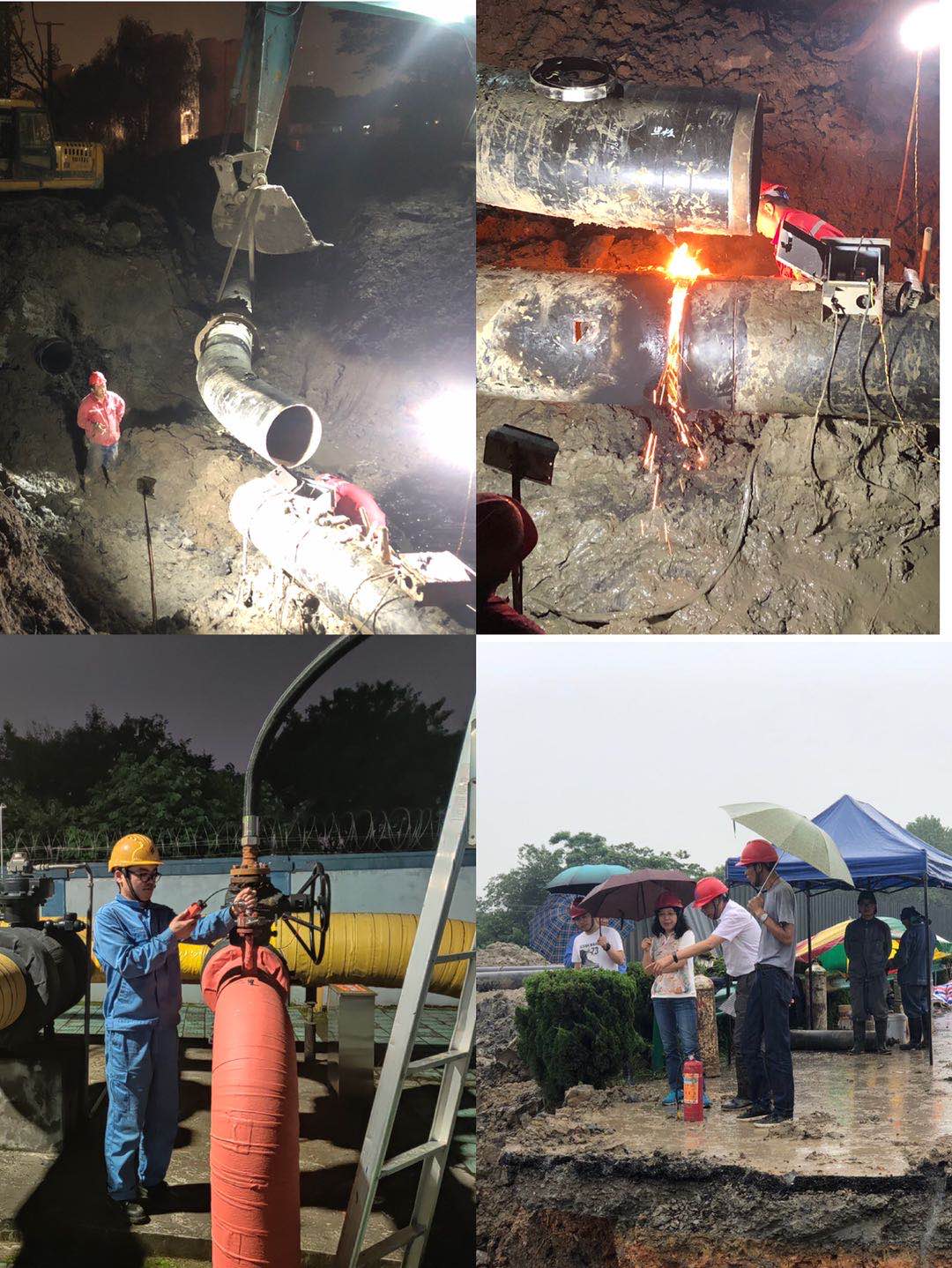 在配合西站枢纽、湖杭铁路建设工程管道迁改工作,高压储配分公司全体干部员工发挥团队作用,特别是割接置换现场,一线员工冒雨守在场站内,守在割接现场,按作业步骤规范实施;运营服务部协调下游供气和组织生产运行调整;HSSE部检测验证置换质量;中石化杭燃配合调整西部站加气业务、临安杭燃按照LNG主供、管容气应急供气方案,落实气源组织,全力保障临安区供气。