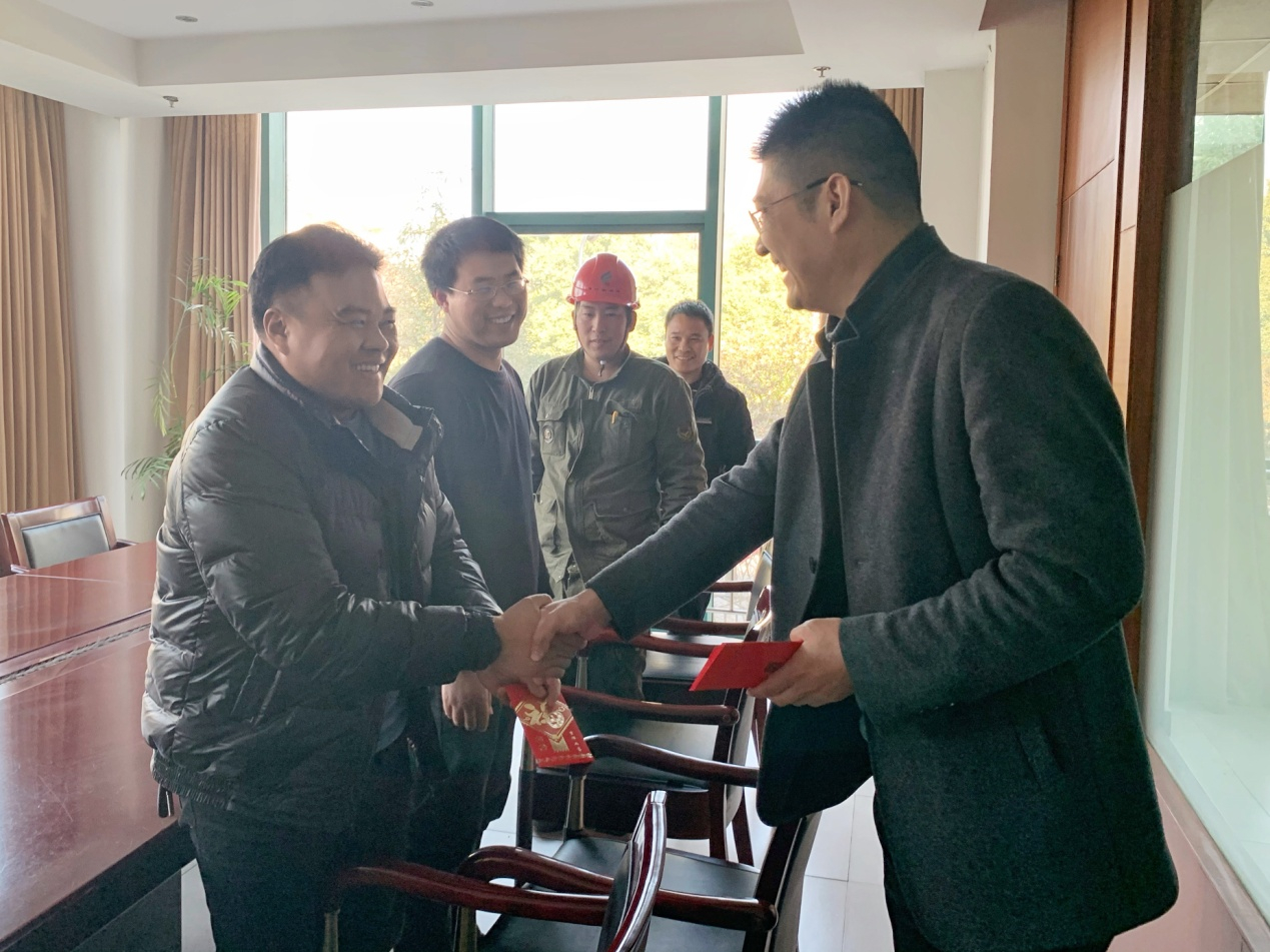 工程公司在集团的带领下积极响应此次行动,倡导和保障外来务工人员在杭过大年,并通过企业申报争取该项福利。1月29日下午,公司党支部书记、总经理冯其栋和工会主席管志鸿代表两级组织对15名符合条件的非浙江户籍春节期间不返乡员工进行慰问,对各位舍小家、顾大家的崇高精神表示感谢,并向每人发放1000元“在杭大红包”。