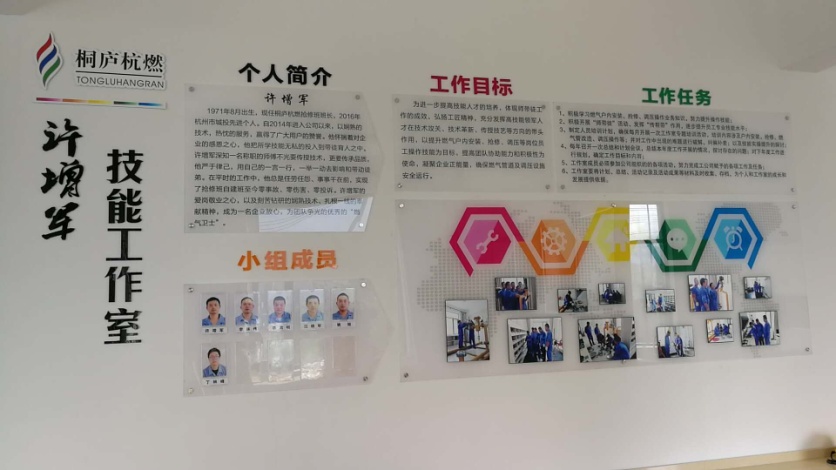 今年8月,桐庐杭燃终于有了自己的技能工作室,我们将其命名为“许增军”技能工作室。自今年5月初筹建“许增军技能工作室”以来,桐庐杭燃以弘扬工匠精神、技术攻关、技术革新、传授技艺为目的进行建设。经过近2个月的奋战,工作室终于在7月14日全部建设完成。培训室面积约58平方,现有套丝机、调压器、龙门架、灶具台,楼调、电焊机、热水器、电脑等培训设施,可满足10余人同时参加户内安检及调压训练,为企业的户内安装、优家产品安装队伍人才培养,员工技能提升搭建了良好的平台。