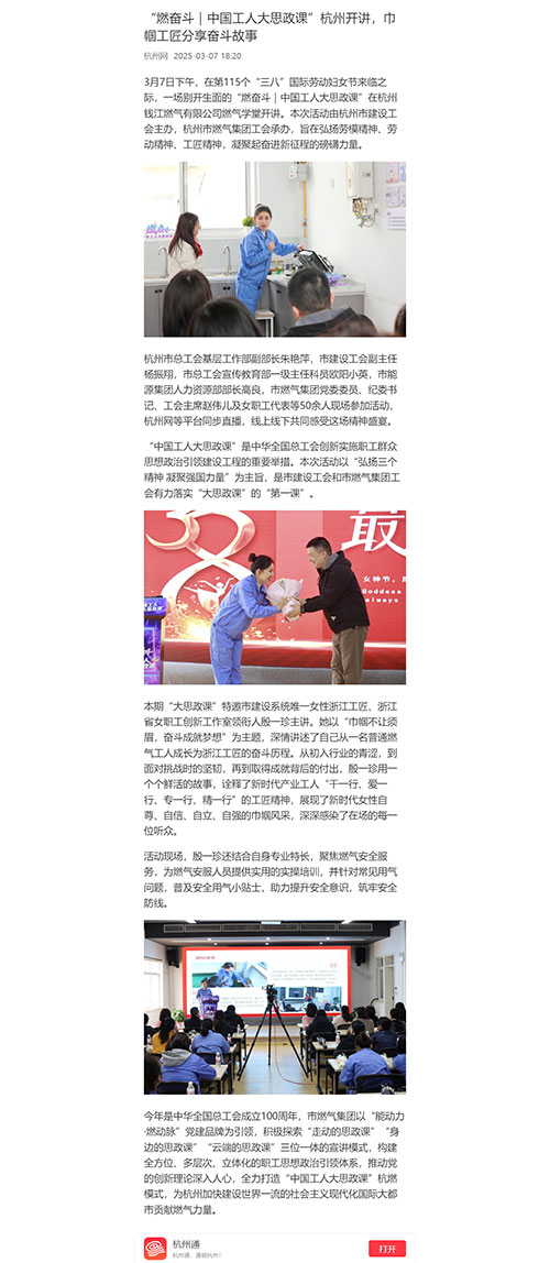 3月7日下午,在第115个“三八”国际劳动妇女节来临之际,一场别开生面的“燃奋斗|中国工人大思政课”在杭州钱江燃气有限公司燃气学堂开讲。本次活动由杭州市建设工会主办,日本女优 工会承办,旨在弘扬劳模精神、劳动精神、工匠精神,凝聚起奋进新征程的磅礴力量。