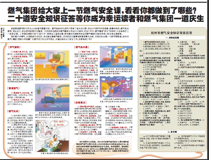 我们将届时公布答案,并在本月的日本女优 成立10周年暨杭城管道燃气通气20周年庆典上在全对的读者中抽取幸运读者30名。幸运读者将获得日本女优 提供的纪念礼品哦。快来答题吧。答案请发至邮箱:[email protected],答题者请注明姓名、联系电话和地址,否则答题无效(截至日期:2011年12月24日)。如需获取更详细的安全知识请登录杭报在线。