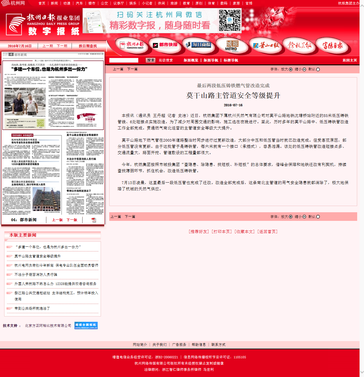 最后两段低压铸铁燃气管改造完成 莫干山路主管道安全等级提升