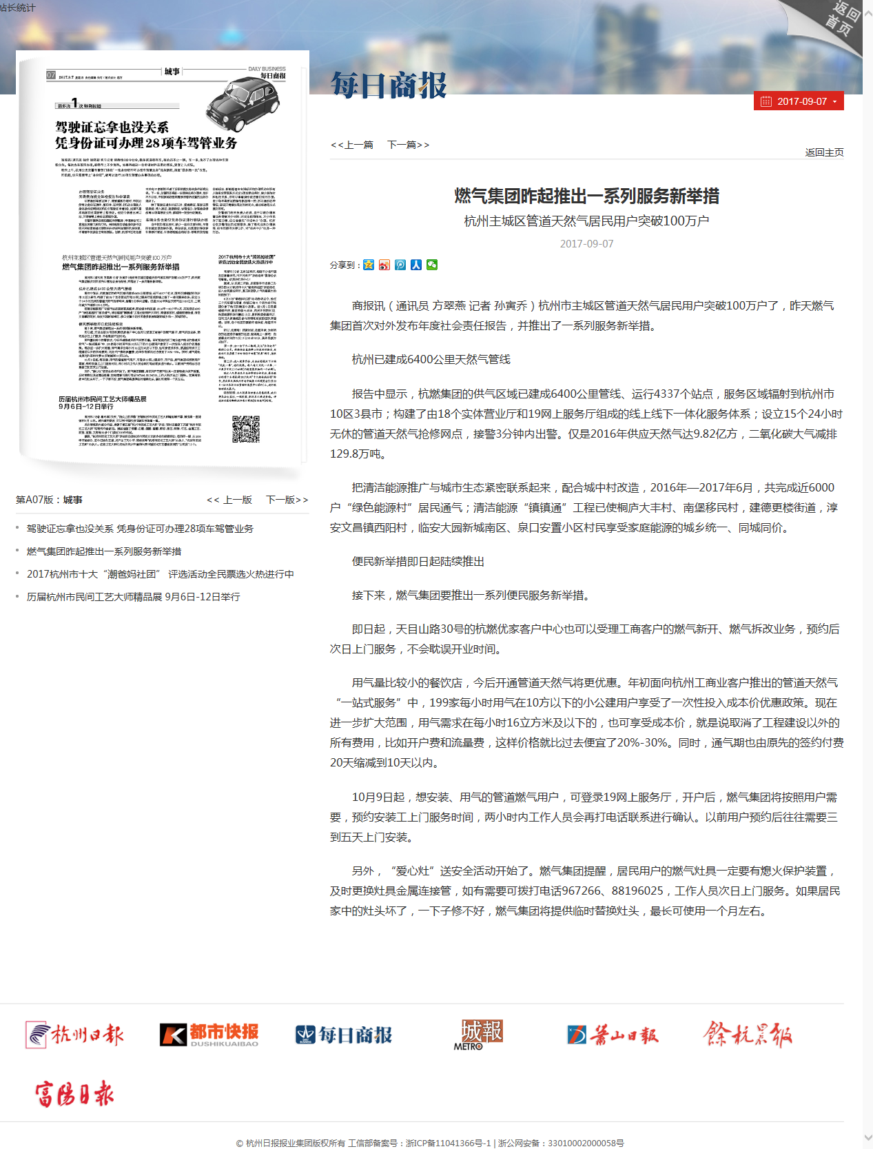 报告中显示,日本女优 的供气区域已建成6400公里管线、运行4337个站点,服务区域辐射到杭州市10区3县市;构建了由18个实体营业厅和19网上服务厅组成的线上线下一体化服务体系;设立15个24小时无休的管道天然气抢修网点,接警3分钟内出警。仅是2016年供应天然气达9.82亿方,二氧化碳大气减排129.8万吨。