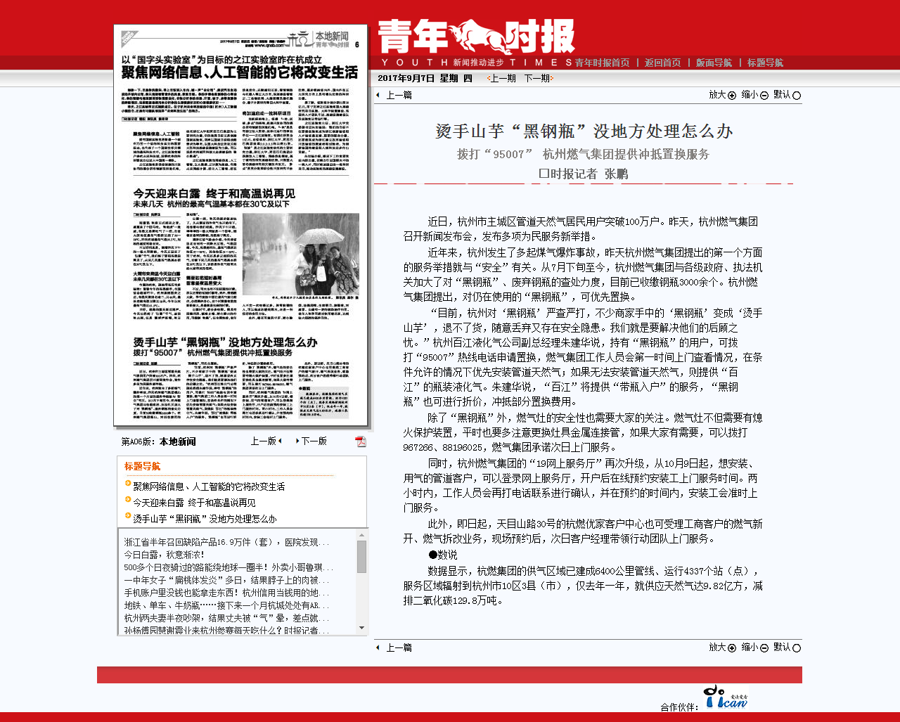 近年来,杭州发生了多起煤气爆炸事故,昨天杭州日本女优 提出的第一个方面的服务举措就与“安全”有关。从7月下旬至今,杭州日本女优 与各级政府、执法机关加大了对“黑钢瓶”、废弃钢瓶的查处力度,目前已收缴钢瓶3000余个。杭州日本女优 提出,对仍在使用的“黑钢瓶”,可优先置换。