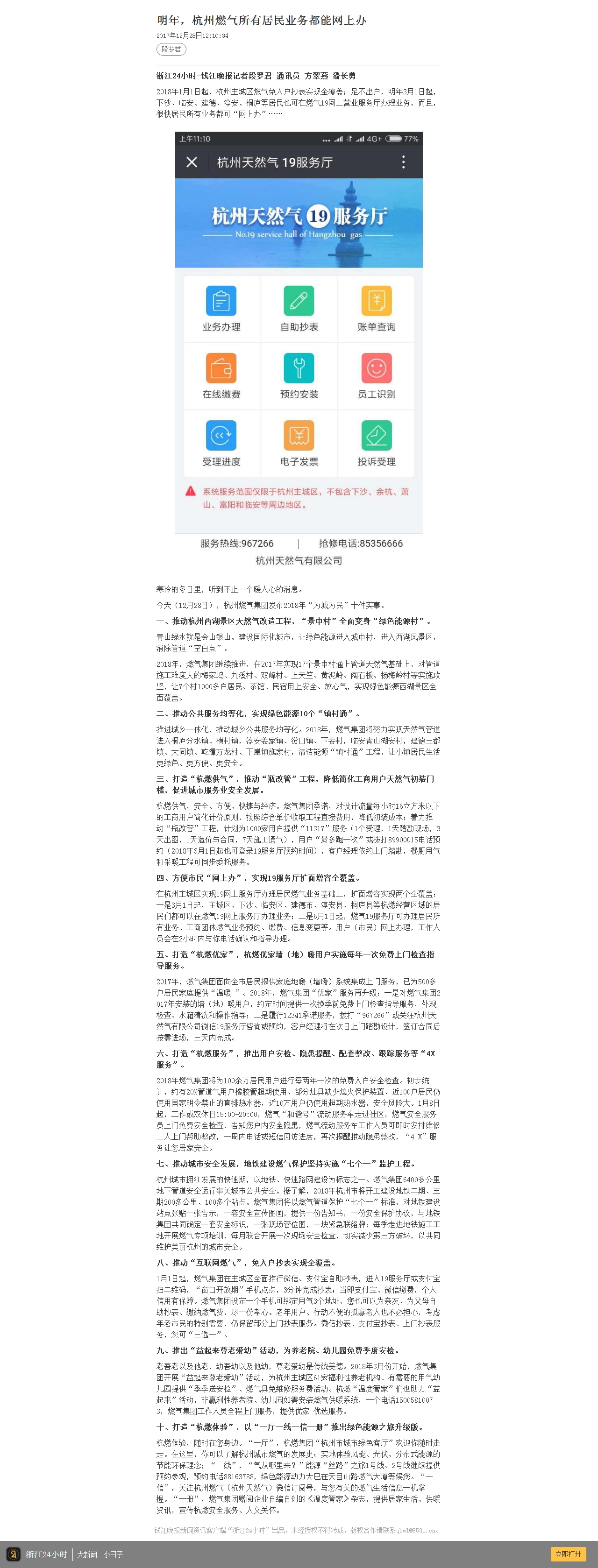2018年1月1日起,杭州主城区燃气免入户抄表实现全覆盖;足不出户,明年3月1日起,下沙、临安、建德、淳安、桐庐等居民也可在燃气19网上营业服务厅办理业务,而且,很快居民所有业务都可“网上办”……