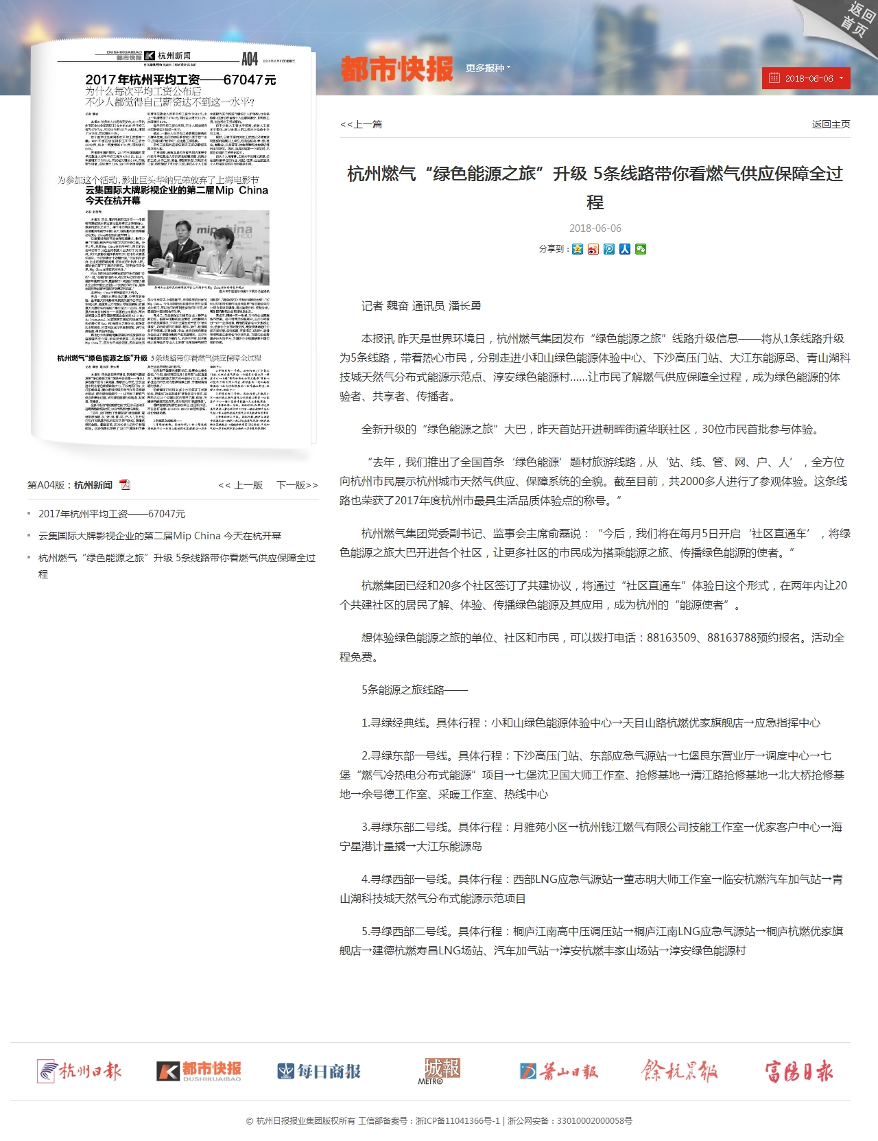 “去年,我们推出了全国首条‘绿色能源’题材旅游线路,从‘站、线、管、网、户、人’,全方位向杭州市民展示杭州城市天然气供应、保障系统的全貌。截至目前,共2000多人进行了参观体验。这条线路也荣获了2017年度杭州市最具生活品质体验点的称号。”