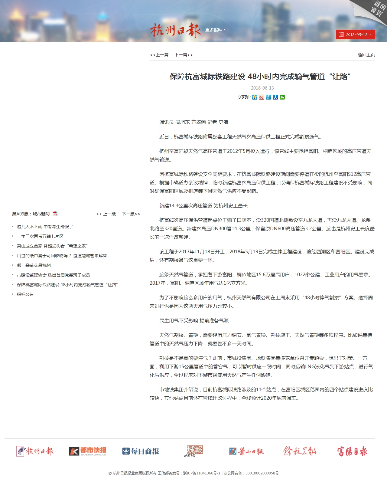 杭州至富阳段天然气高压管道于2012年5月投入运行,该管线主要承担富阳、桐庐区域的高压管道天然气输送。