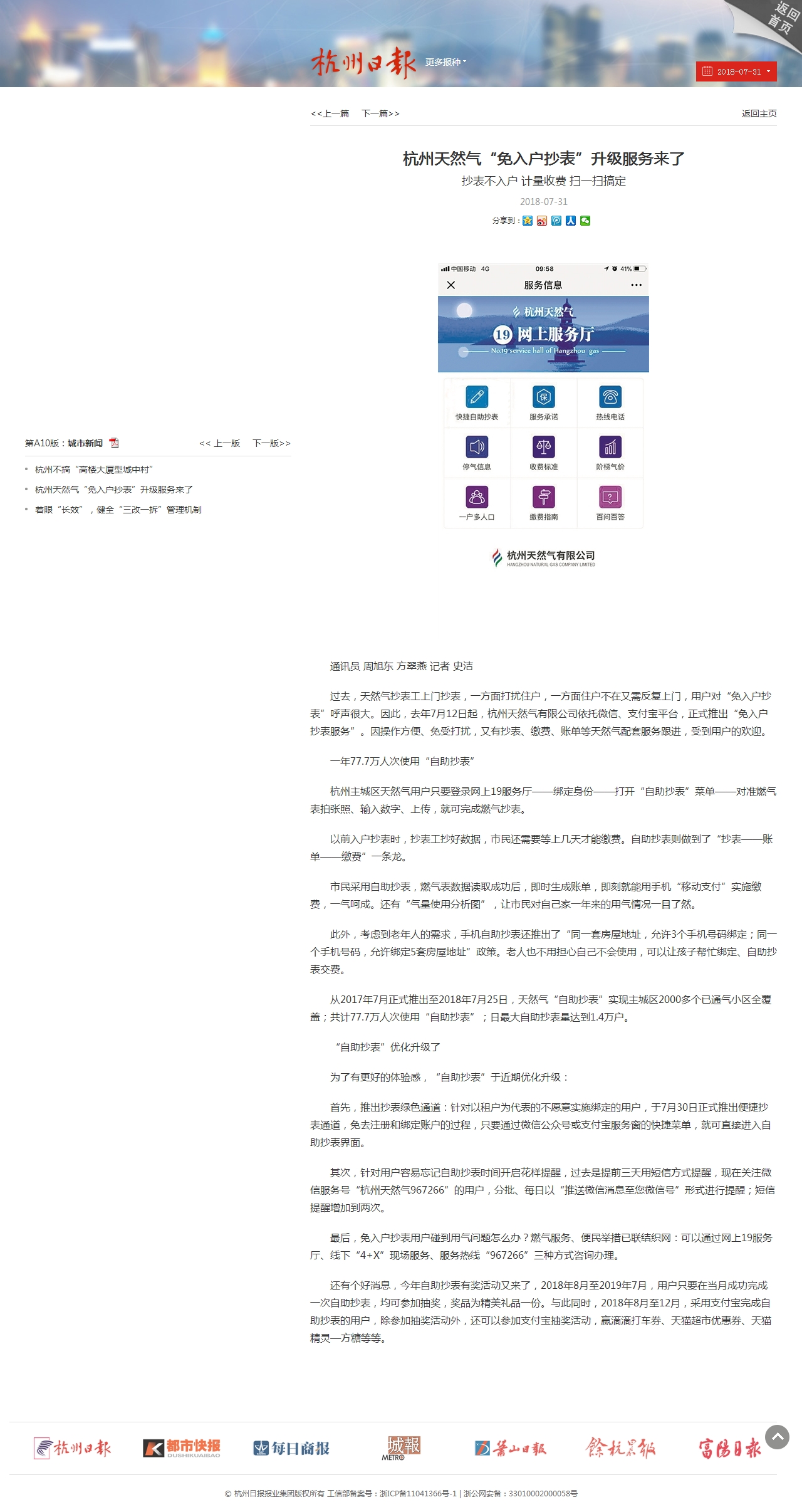 从2017年7月正式推出至2018年7月25日,天然气“自助抄表”实现主城区2000多个已通气小区全覆盖;共计77.7万人次使用“自助抄表”;日最大自助抄表量达到1.4万户。