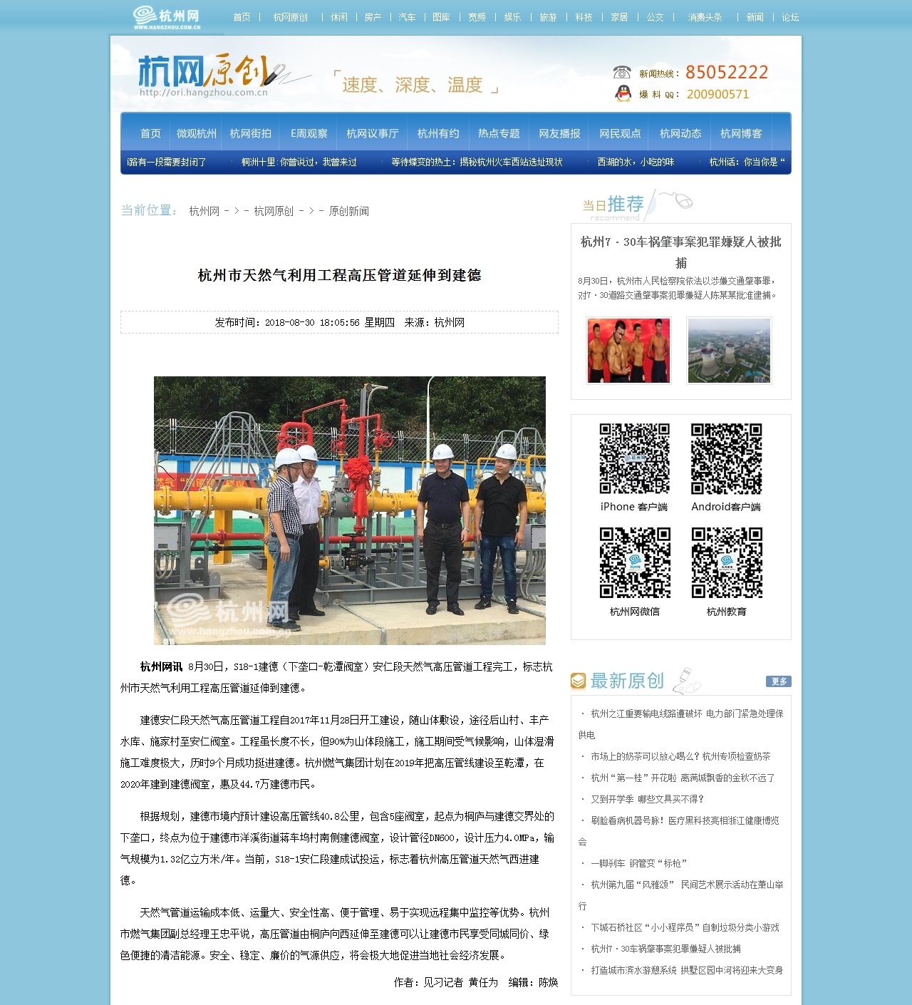 杭州网讯 8月30日,S18-1建德(下垄口-乾潭阀室)安仁段天然气高压管道工程完工,标志杭州市天然气利用工程高压管道延伸到建德。