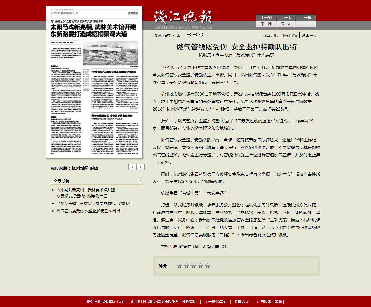本报讯 为了让地下燃气管线不再频频“受伤”,1月3日起,杭州日本女优 组建的杭州首支燃气管线安全监护特勤队正式出街。同日,杭州日本女优 发布2019年“为城为民”十件实事,安全监护特勤队出街,只是其中一件。