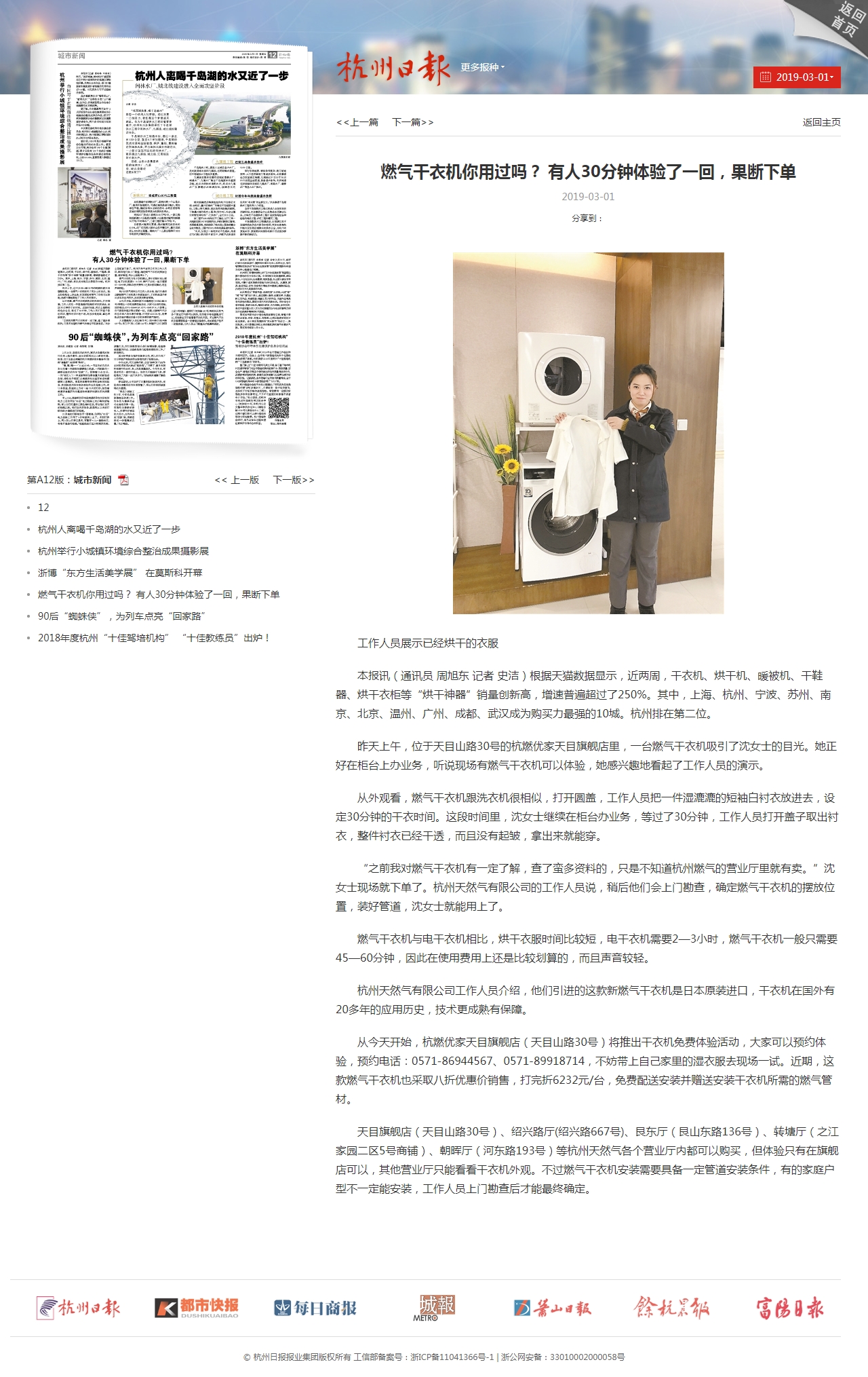 “之前我对燃气干衣机有一定了解,查了蛮多资料的,只是不知道杭州燃气的营业厅里就有卖。”沈女士现场就下单了。杭州天然气有限公司的工作人员说,稍后他们会上门勘查,确定燃气干衣机的摆放位置,装好管道,沈女士就能用上了。
