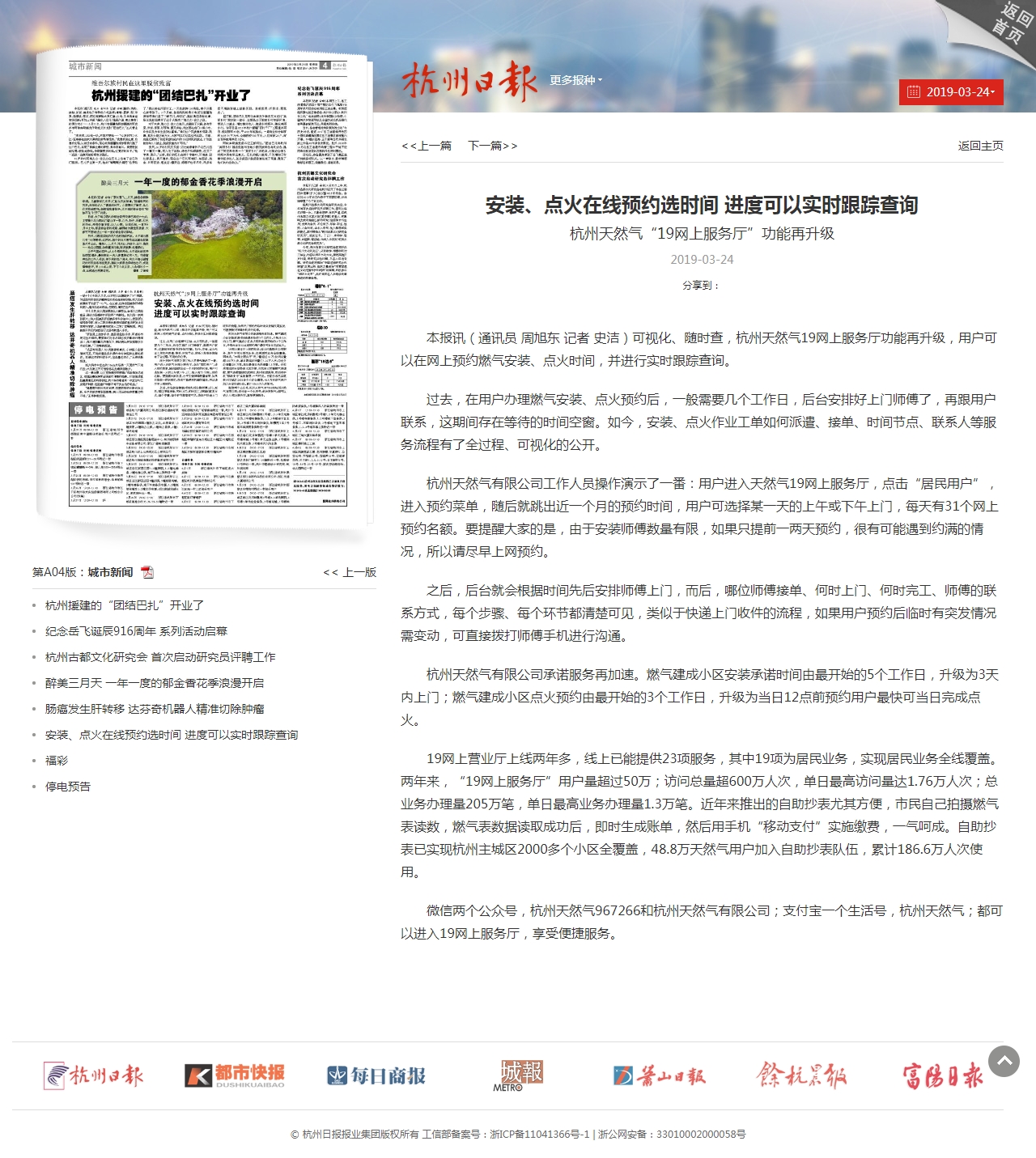19网上营业厅上线两年多,线上已能提供23项服务,其中19项为居民业务,实现居民业务全线覆盖。两年来,“19网上服务厅”用户量超过50万;访问总量超600万人次,单日最高访问量达1.76万人次;总业务办理量205万笔,单日最高业务办理量1.3万笔。近年来推出的自助抄表尤其方便,市民自己拍摄燃气表读数,燃气表数据读取成功后,即时生成账单,然后用手机“移动支付”实施缴费,一气呵成。自助抄表已实现杭州主城区2000多个小区全覆盖,48.8万天然气用户加入自助抄表队伍,累计186.6万人次使用。