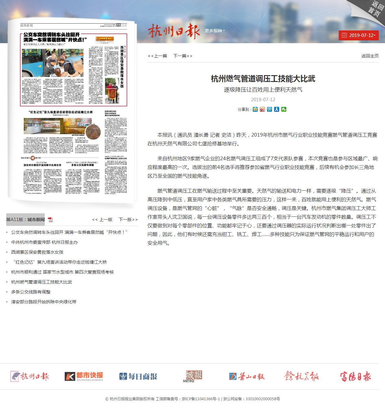 本报讯(通讯员 潘长勇 记者 史洁)昨天,2019年杭州市燃气行业职业技能竞赛燃气管道调压工竞赛在杭州天然气有限公司七堡抢修基地举行。