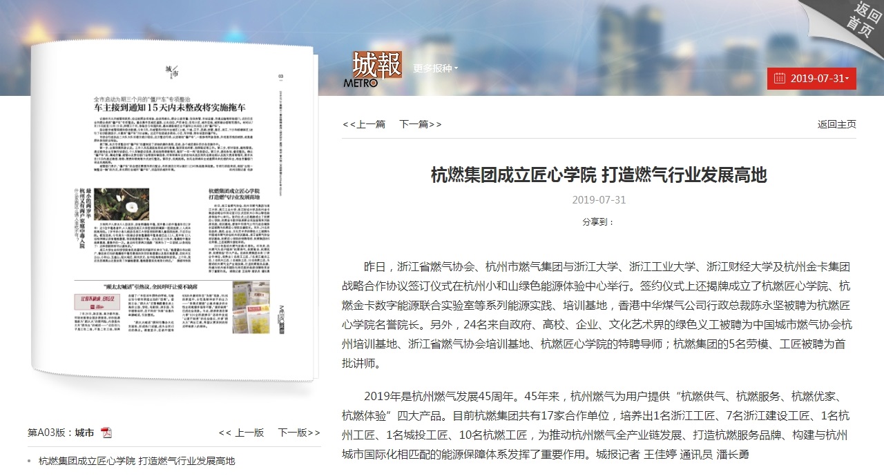 与浙江大学、浙江工业大学、浙江财经大学及杭州金卡集团战略合作协议签订仪式在杭州小和山绿色能源体验中心举行。签约仪式上还揭牌成立了杭燃匠心学院、杭燃金卡数字能源联合实验室等系列能源实践、培训基地,香港中华煤气公司行政总裁陈永坚被聘为杭燃匠心学院名誉院长。另外,24名来自政府、高校、企业、文化艺术界的绿色义工被聘为中国城市燃气协会杭州培训基地、浙江省燃气协会培训基地、杭燃匠心学院的特聘导师;日本女优