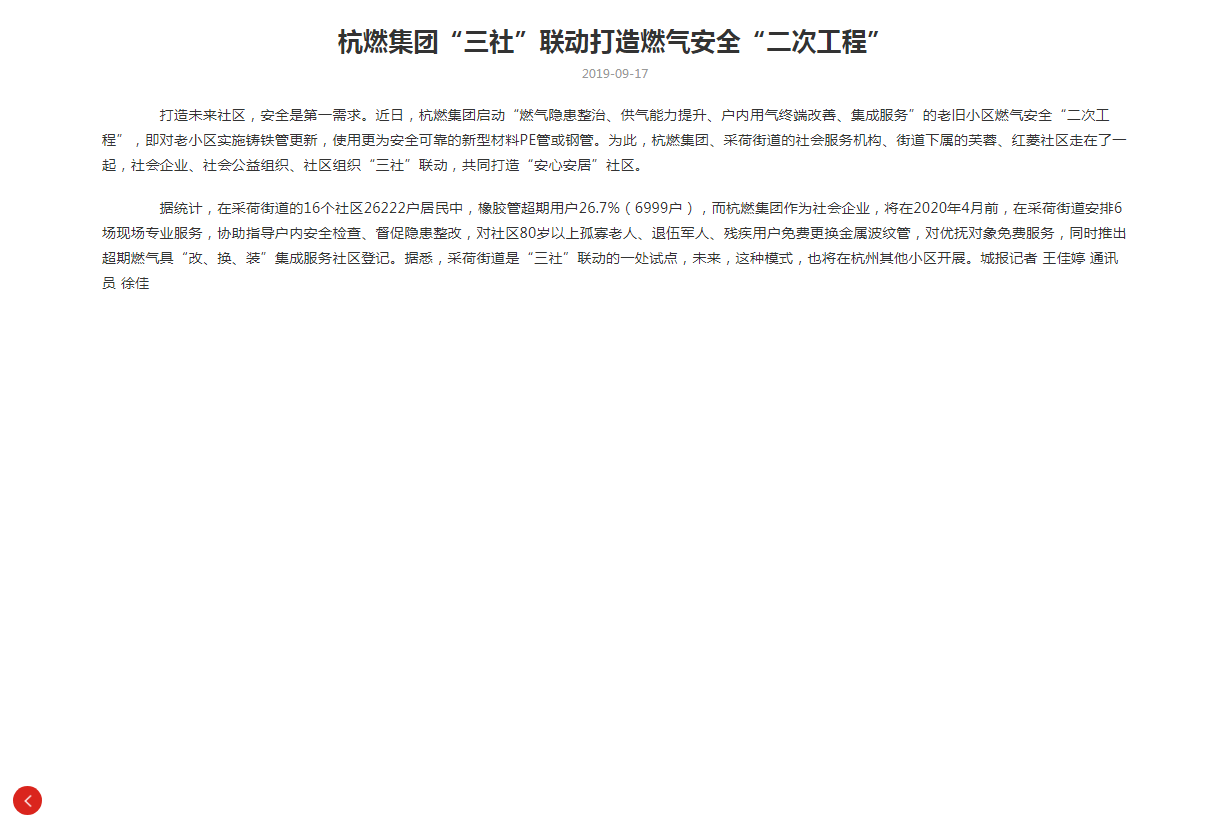 打造未来社区,安全是第一需求。近日,日本女优 启动“燃气隐患整治、供气能力提升、户内用气终端改善、集成服务”的老旧小区燃气安全“二次工程”,即对老小区实施铸铁管更新,使用更为安全可靠的新型材料PE管或钢管。为此,日本女优 、采荷街道的社会服务机构、街道下属的芙蓉、红菱社区走在了一起,社会企业、社会公益组织、社区组织“三社”联动,共同打造“安心安居”社区。