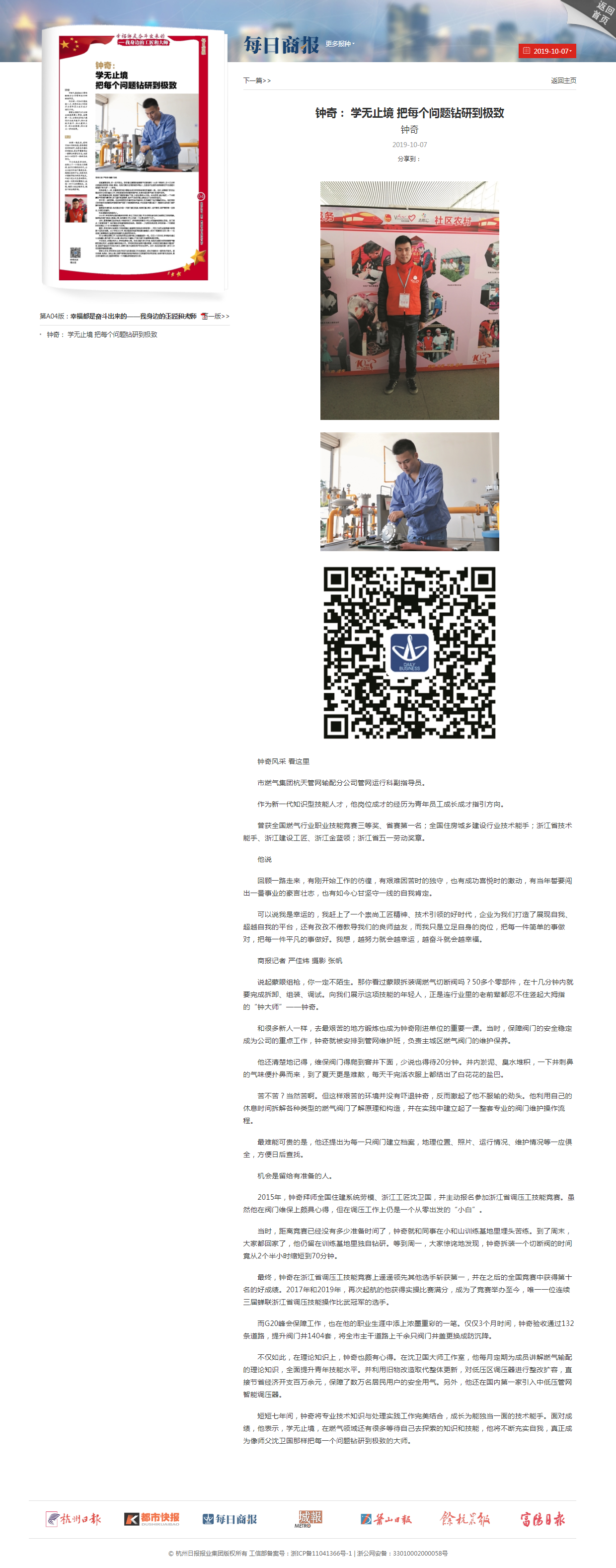 短短七年间,钟奇将专业技术知识与处理实践工作完美结合,成长为能独当一面的技术能手。面对成绩,他表示,学无止境,在燃气领域还有很多等待自己去探索的知识和技能,他将不断充实自我,真正成为像师父沈卫国那样把每一个问题钻研到极致的大师。