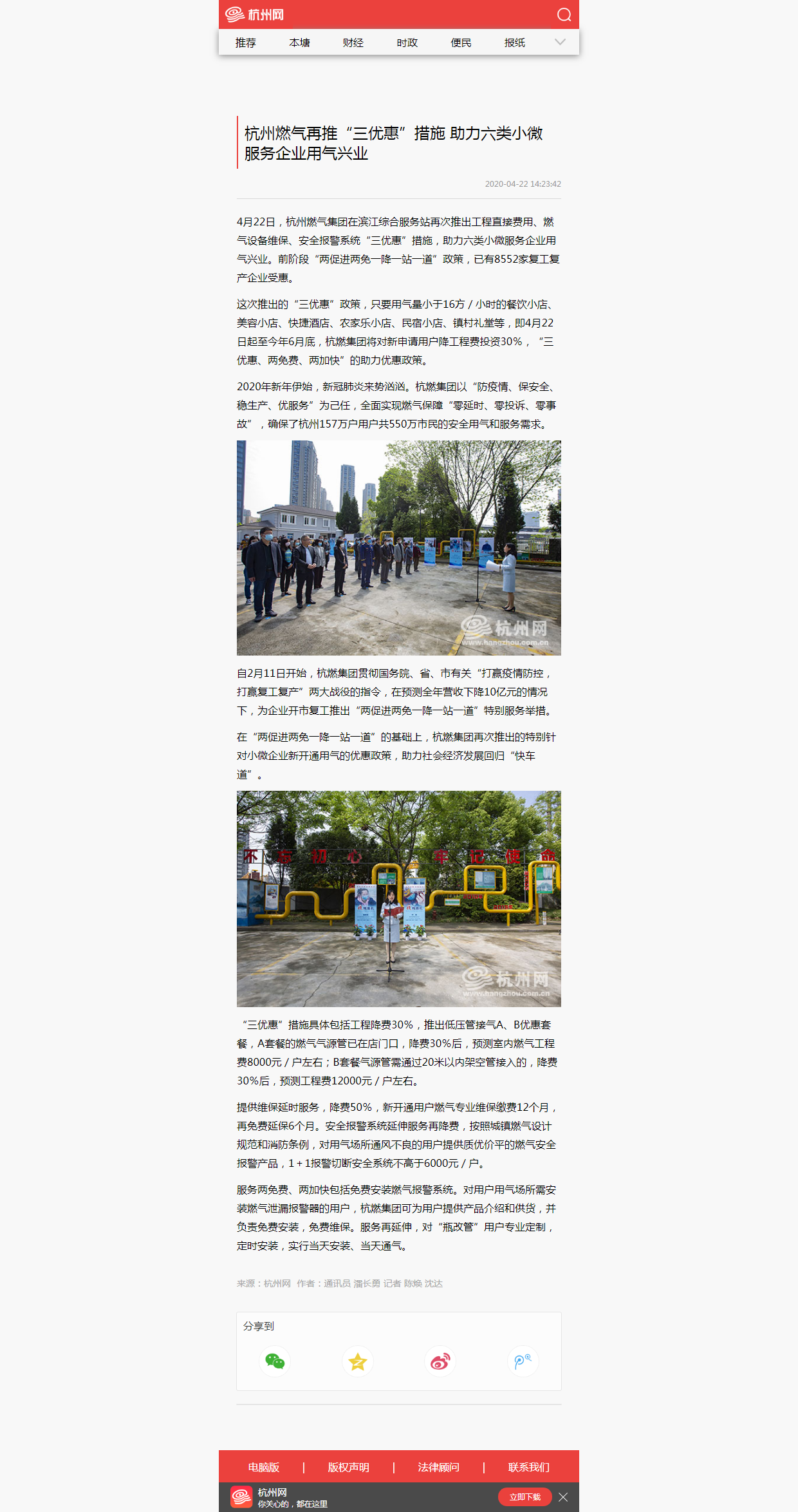 4月22日,杭州日本女优 在滨江综合服务站再次推出工程直接费用、燃气设备维保、安全报警系统“三优惠”措施,助力六类小微服务企业用气兴业。前阶段“两促进两免一降一站一道”政策,已有8552家复工复产企业受惠。