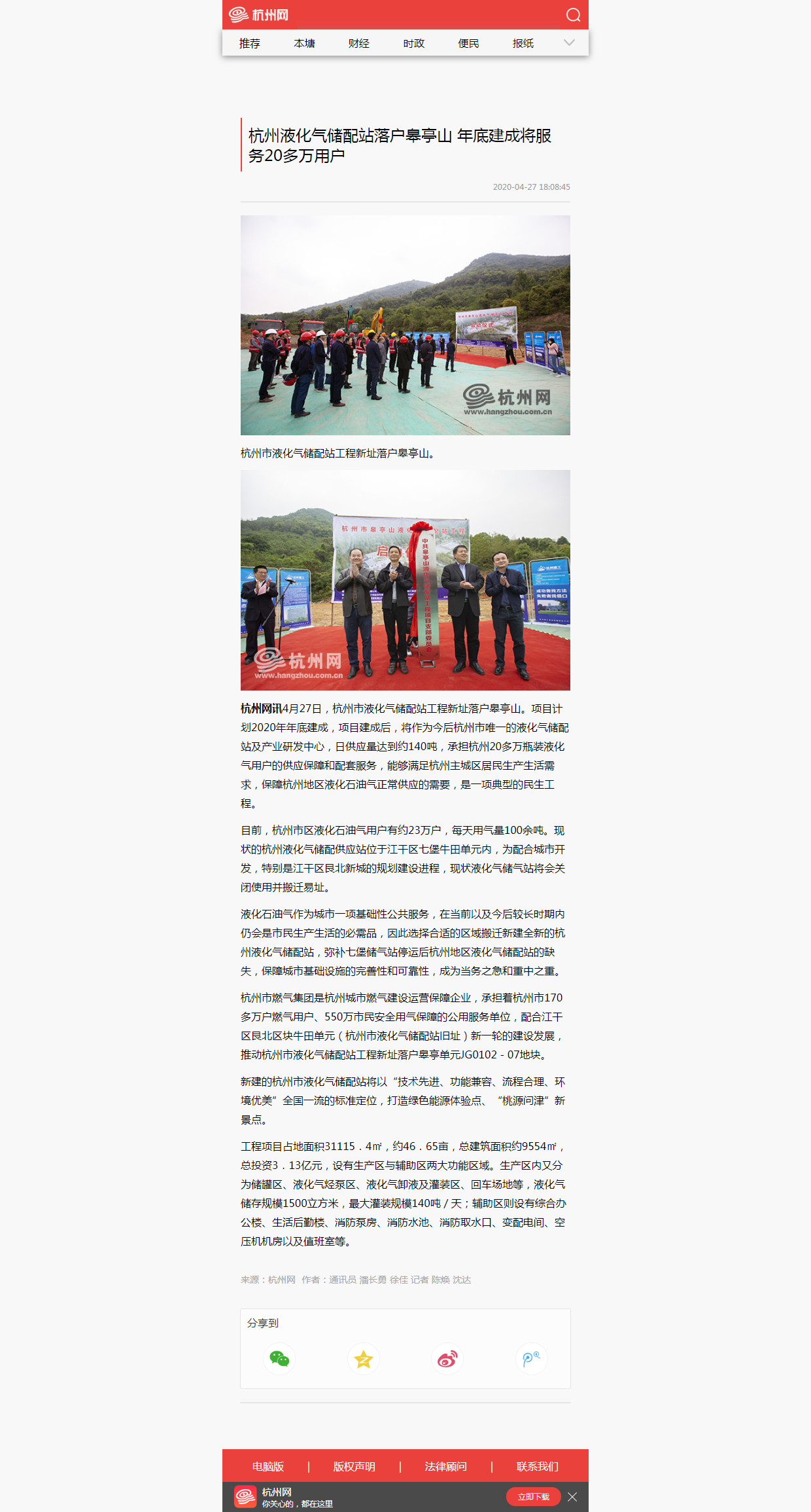 杭州网讯4月27日,杭州市液化气储配站工程新址落户皋亭山。项目计划2020年年底建成,项目建成后,将作为今后杭州市唯一的液化气储配站及产业研发中心,日供应量达到约140吨,承担杭州20多万瓶装液化气用户的供应保障和配套服务,能够满足杭州主城区居民生产生活需求,保障杭州地区液化石油气正常供应的需要,是一项典型的民生工程。