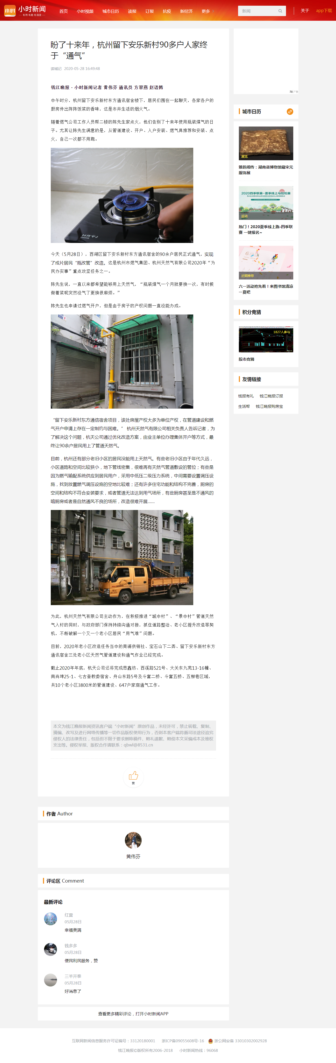 截止2020年年底,杭天公司还将完成思鑫坊、西溪路521号、大关东九苑13-16幢、南肖埠25-1、七古登教委宿舍、舟山东路5号及斗富二桥、斗富五桥、五柳巷区域,共10个老小区3800米的管道建设、647户家庭通气工作。