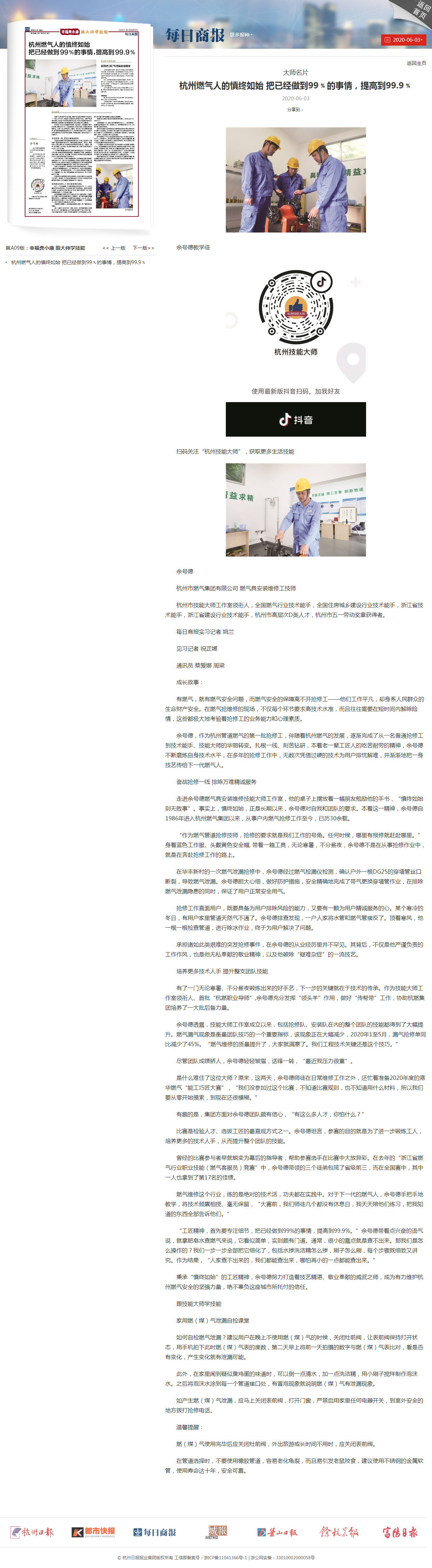 秉承“慎终如始”的工匠精神,余号德努力打造着技艺精湛、敬业奉献的威武之师,成为有力维护杭州燃气安全的坚强力量,绝不辜负这座城市所托付的信任。