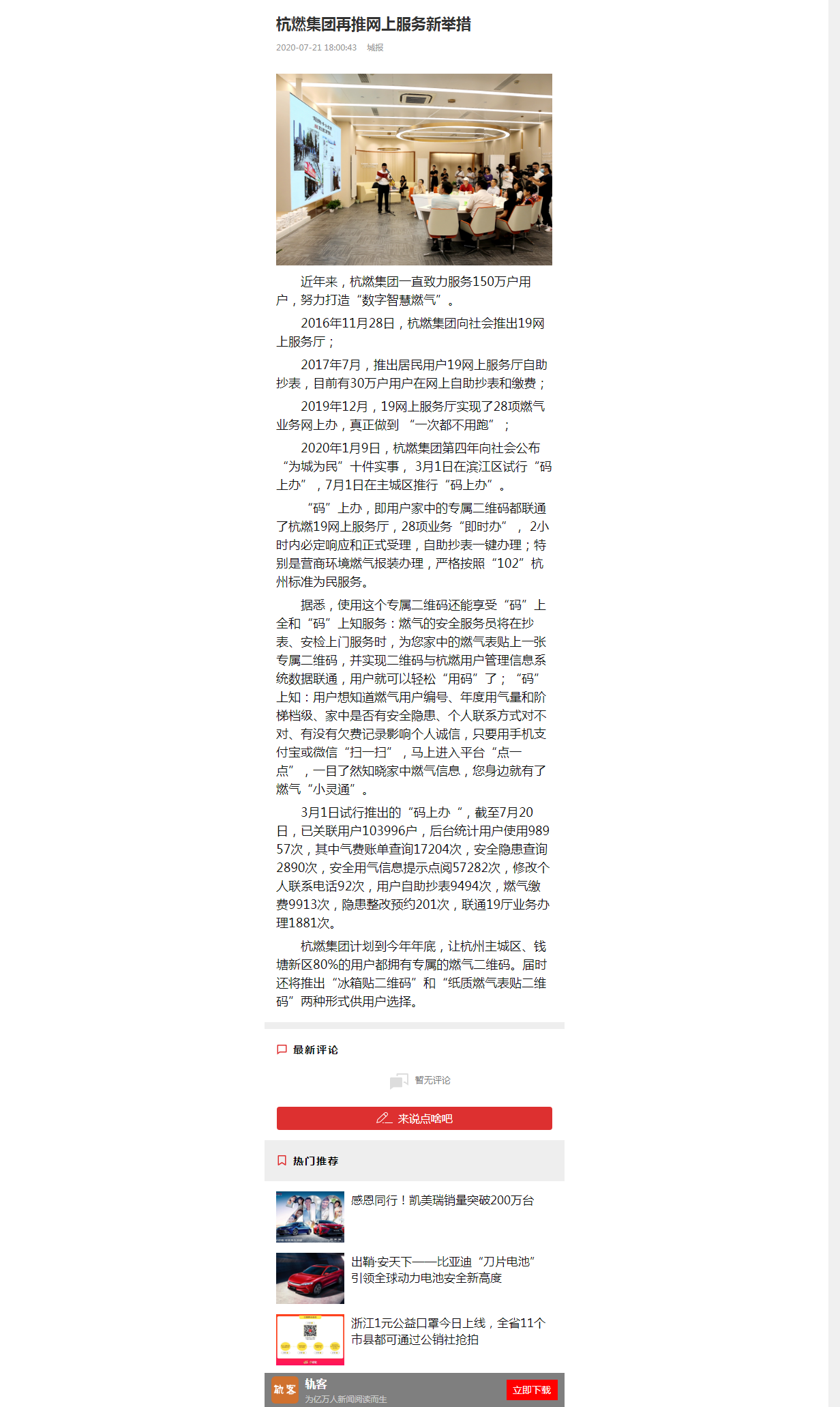 “码”上办,即用户家中的专属二维码都联通了杭燃19网上服务厅,28项业务“即时办”, 2小时内必定响应和正式受理,自助抄表一键办理;特别是营商环境燃气报装办理,严格按照“102”杭州标准为民服务。