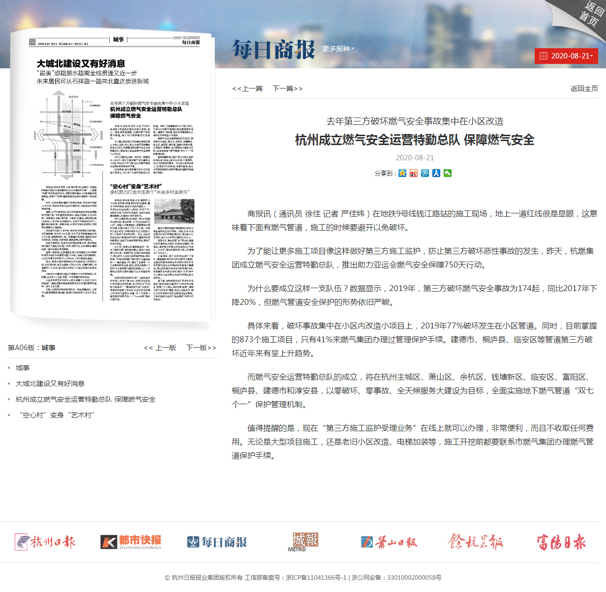 而燃气安全运营特勤总队的成立,将在杭州主城区、萧山区、余杭区、钱塘新区、临安区、富阳区、桐庐县、建德市和淳安县,以零破坏、零事故、全天候服务大建设为目标,全面实施地下燃气管道“双七个一”保护管理机制。