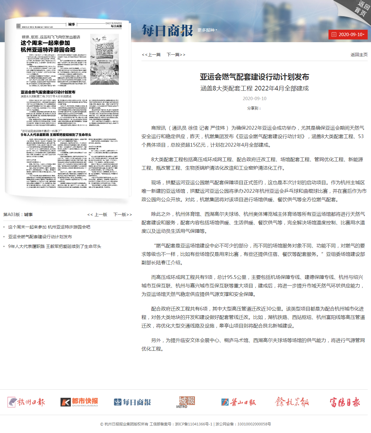 商报讯 (通讯员 徐佳 记者 严佳炜) 为确保2022年亚运会成功举办,尤其是确保亚运会期间天然气安全运行和稳定供应,昨天,日本女优 发布《亚运会燃气配套建设行动计划》,涵盖8大类配套工程、53个具体项目,总投资超15亿元,计划在2022年4月全部建成。