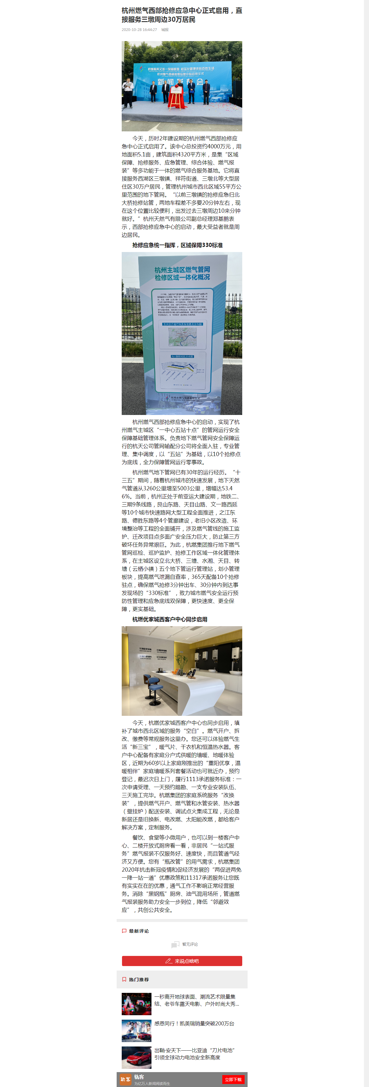 今天,历时2年建设期的杭州燃气西部抢修应急中心正式启用了。该中心总投资约4000万元,用地面积5.1亩,建筑面积4320平方米,是集“区域保障、抢修服务、应急管理、综合体验、燃气报装”等多功能于一体的燃气综合服务基地。它将直接服务西湖区三墩镇、祥符街道、三墩北等大型居住区30万户居民,管理杭州城市西北区域55平方公里范围的地下管网。“以前三墩镇的抢修应急归北大桥抢修站管,两地车程差不多要20分钟左右,现在这个位置比较便利,出发过去三墩周边10来分钟就好。”杭州天然气有限公司副总经理郑基鹏表示,西部抢修应急中心的启动,最大受益者就是周边居民。