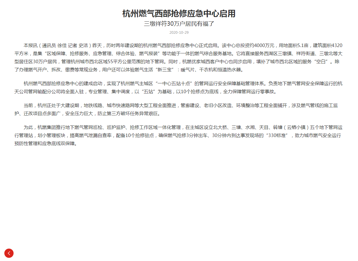 本报讯(通讯员 徐佳 记者 史洁)昨天,历时两年建设期的杭州燃气西部抢修应急中心正式启用。该中心总投资约4000万元,用地面积5.1亩,建筑面积4320平方米,是集“区域保障、抢修服务、应急管理、综合体验、燃气报装”等功能于一体的燃气综合服务基地。它将直接服务西湖区三墩镇、祥符街道、三墩北等大型居住区30万户居民,管理杭州城市西北区域55平方公里范围的地下管网。同时,杭燃优家城西客户中心也同步启用,填补了城市西北区域的服务“空白”。除了办理燃气开户、拆改、缴费等常规业务,用户还可以体验燃气生活“新三宝”:暖气片、干衣机和恒温热水器。