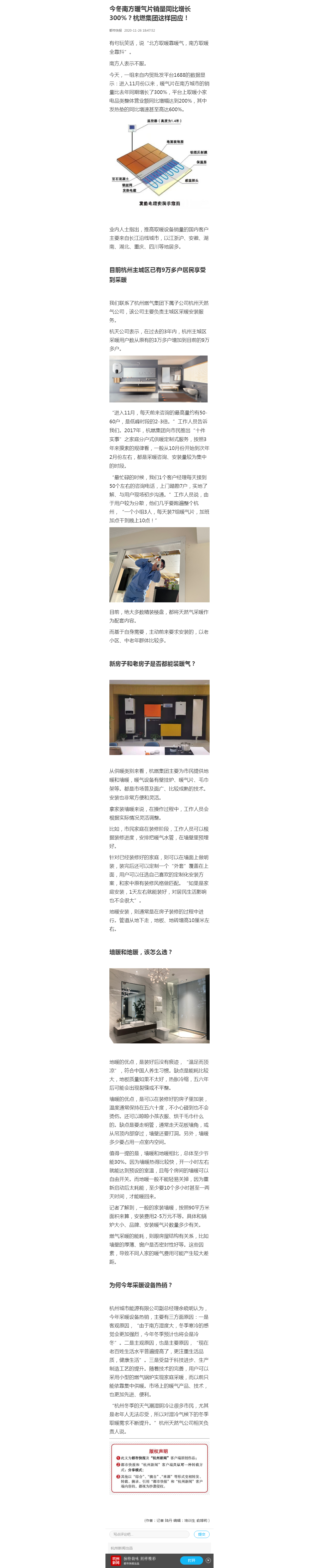 “杭州冬季的天气潮湿阴冷让很多市民,尤其是老年人无法忍受,所以对湿冷气候下的冬季取暖需求不断提升。”杭州天然气公司相关负责人说。