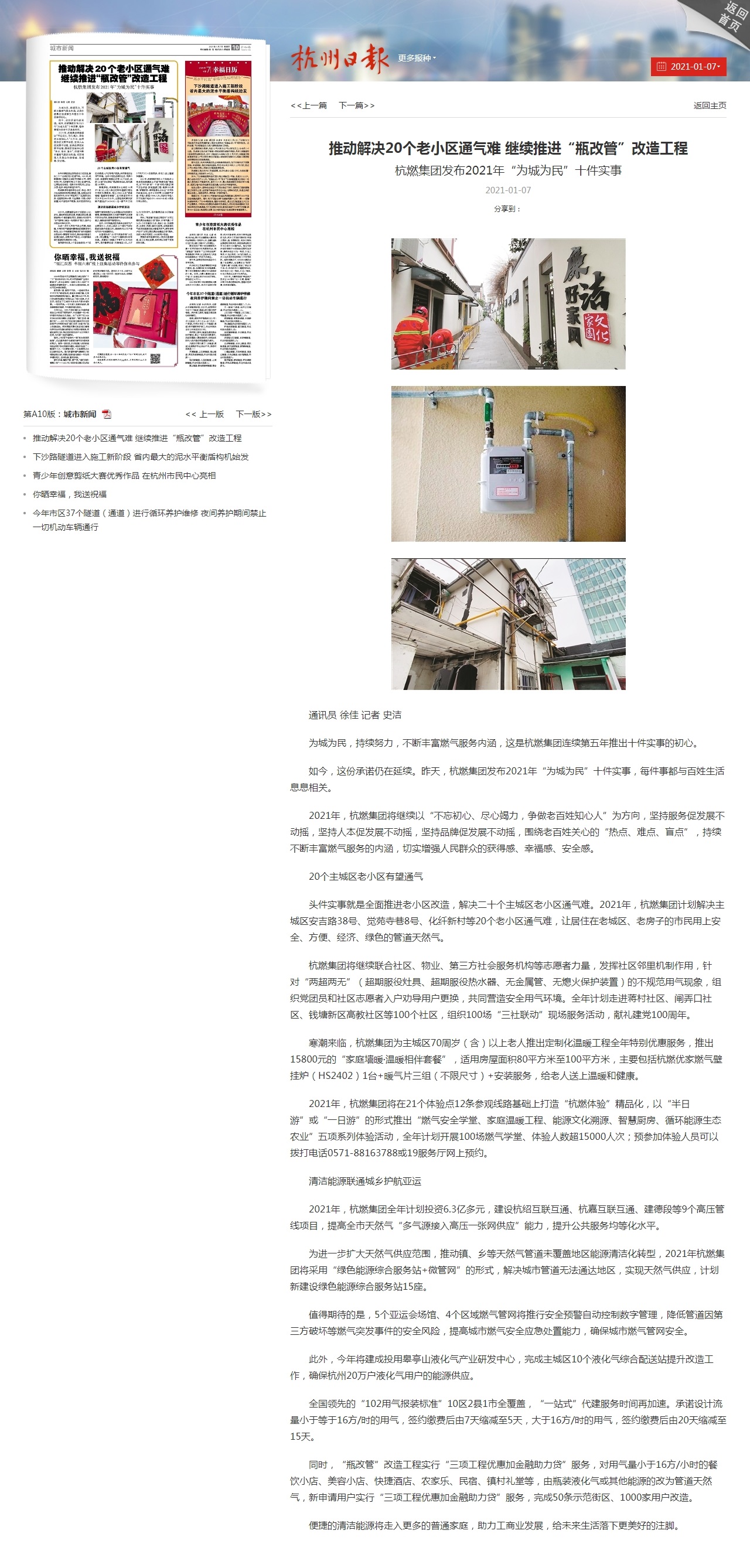 头件实事就是全面推进老小区改造,解决二十个主城区老小区通气难。2021年,日本女优 计划解决主城区安吉路38号、觉苑寺巷8号、化纤新村等20个老小区通气难,让居住在老城区、老房子的市民用上安全、方便、经济、绿色的管道天然气。