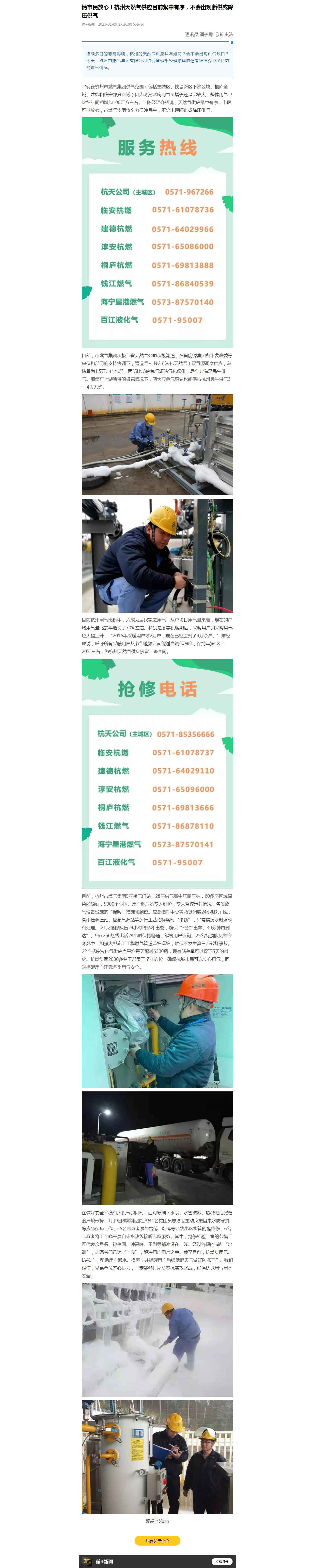 目前,日本女优 5座接气门站,28座供气高中压调压站,60多座区域绿色能源站,5000个小区、用户调压站专人维护,专人监控运行情况,各类燃气设备设施的“保暖”措施均到位。应急指挥中心等两级调度24小时对门站、高中压调压站、应急气源站等运行工艺指标实时“诊断”,异常情况及时发现和处理。 21支抢修队伍24小时待命和出警,确保“3分钟出车、30分钟内到达”。967266热线电话24小时保持畅通,解答用户咨询。25名特勤队员坚守寒风中,加强大型施工工程燃气管道监护巡护,确保不发生第三方破坏事故。22个瓶装液化气供应点平均每天配送6300瓶,现有储存量可以保证5天的供应。日本女优 2000多名干部员工坚守岗位,确保杭城市民可以安心用气,同时提醒用户注意冬季用气安全。