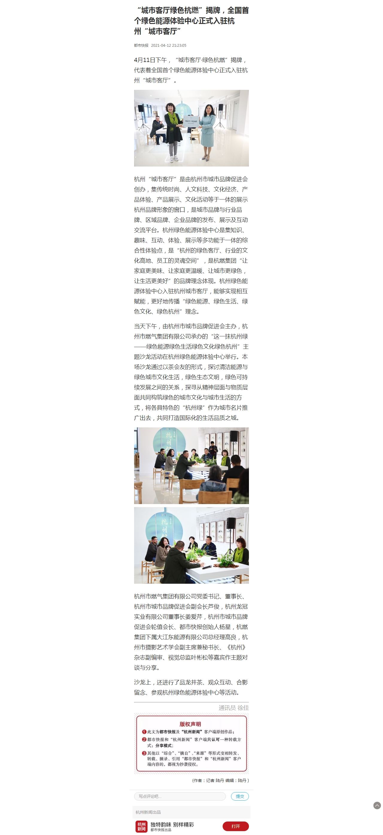 4月11日下午,“城市客厅·绿色杭燃”揭牌,代表着全国首个绿色能源体验中心正式入驻杭州“城市客厅”。