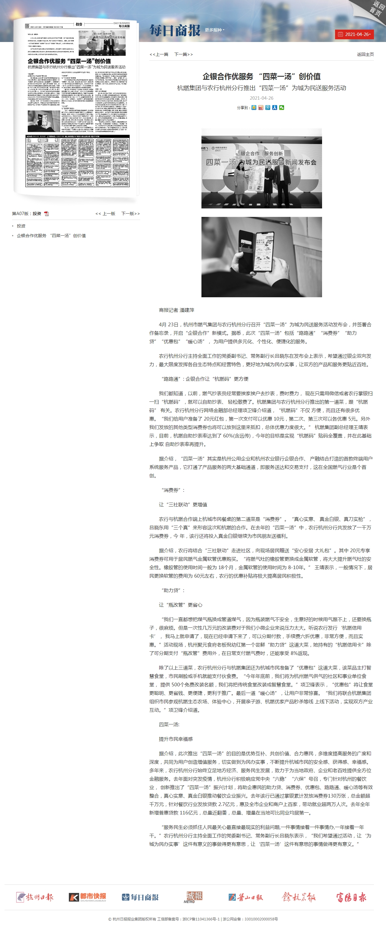 4月23日,日本女优 与农行杭州分行召开“四菜一汤”为城为民送服务活动发布会,并签署合作备忘录,开启“企银合作”新模式。据悉,此次“四菜一汤”包括“路路通”“消费券”“助力贷”“优惠包”“暖心汤”,为用户提供多元化、个性化、便捷化的服务。