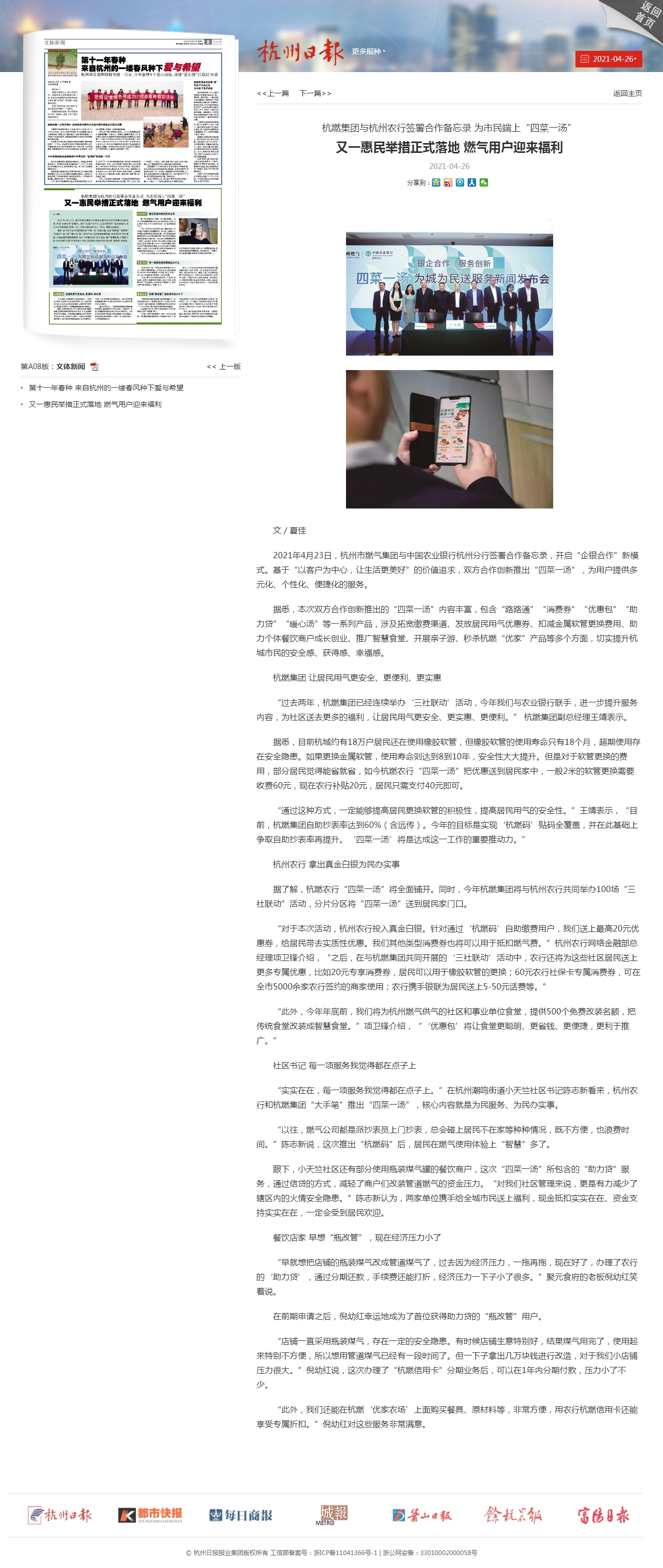 据悉,本次双方合作创新推出的“四菜一汤”内容丰富,包含“路路通”“消费券”“优惠包”“助力贷”“暖心汤”等一系列产品,涉及拓宽缴费渠道、发放居民用气优惠券、扣减金属软管更换费用、助力个体餐饮商户成长创业、推广智慧食堂、开展亲子游、秒杀杭燃“优家”产品等多个方面,切实提升杭城市民的安全感、获得感、幸福感。