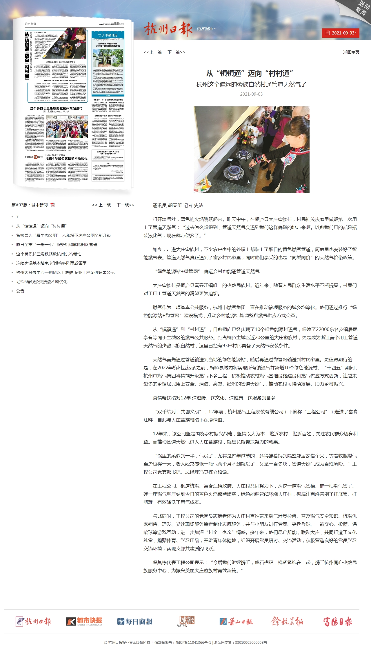 从“镇镇通”到“村村通”,目前桐庐已经实现了10个绿色能源村通气,保障了22000余名乡镇居民享有等同于主城区的燃气公共服务。距离桐庐主城区近20公里的大庄畲族村,更是成为浙江首个用上管道天然气的少数民族自然村,这里已经有93户村民具备了天然气安装条件。