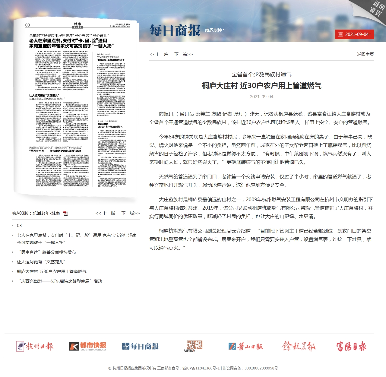 商报讯 (通讯员 蔡美兰 方鹏 记者 张玎)昨天,记者从桐庐县获悉,该县富春江镇大庄畲族村成为全省首个开通管道燃气的少数民族村,该村近30户农户也可以和城里人一样用上安全、安心的管道燃气。