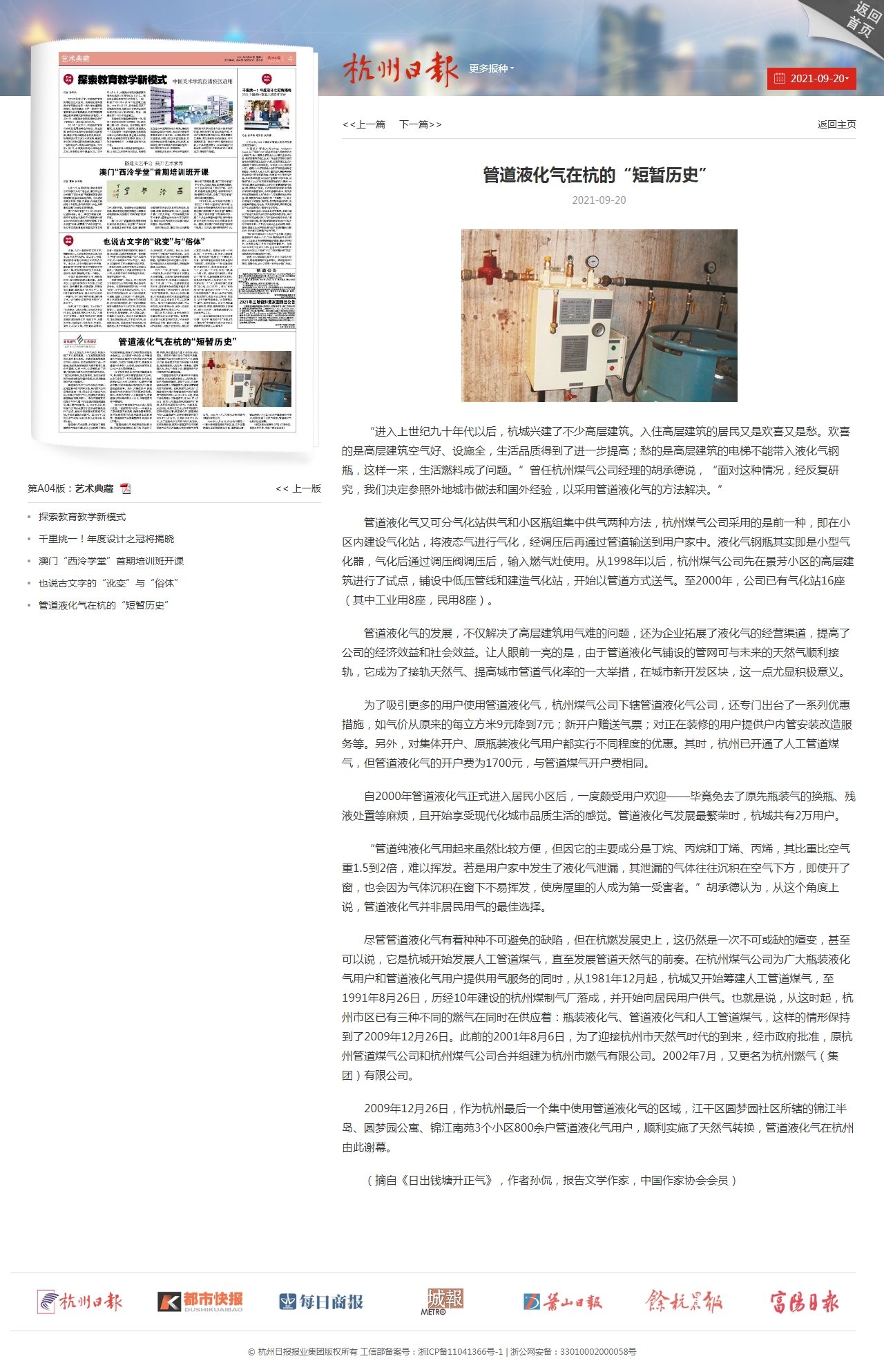 2009年12月26日,作为杭州最后一个集中使用管道液化气的区域,江干区圆梦园社区所辖的锦江半岛、圆梦园公寓、锦江南苑3个小区800余户管道液化气用户,顺利实施了天然气转换,管道液化气在杭州由此谢幕。