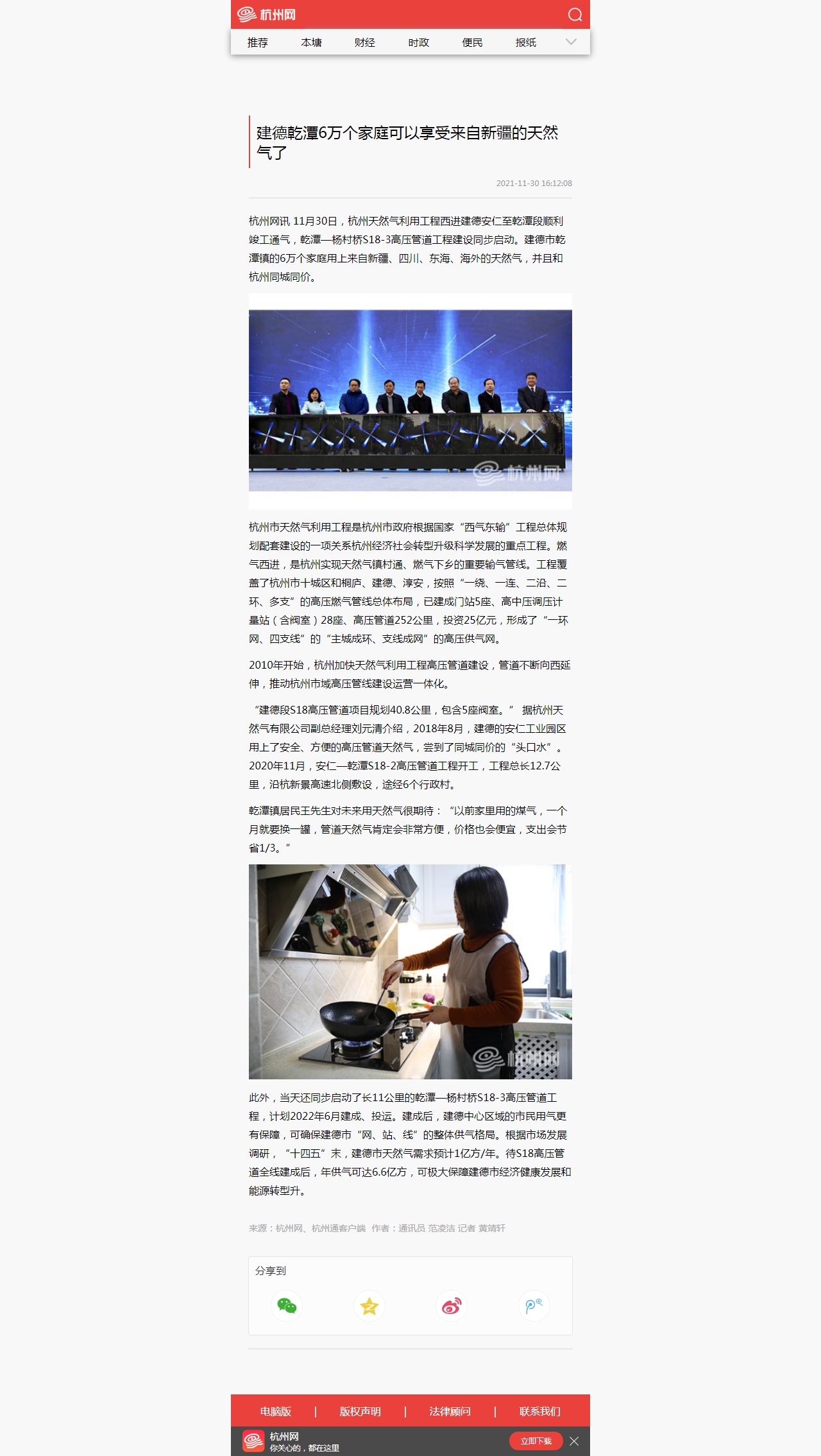 杭州网讯 11月30日,杭州天然气利用工程西进建德安仁至乾潭段顺利竣工通气,乾潭—杨村桥S18-3高压管道工程建设同步启动。建德市乾潭镇的6万个家庭用上来自新疆、四川、东海、海外的天然气,并且和杭州同城同价。