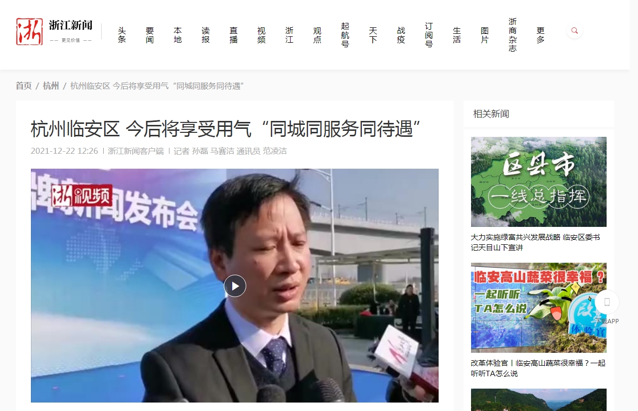 2021年12月22日,杭州临安燃气有限公司挂牌。记者了解到,这是在天然气体制改革背景下,全国首家由央企、省属国企、市属国企合作整合资源成立的城市燃气企业,今后60多万临安区百姓将享受与杭州主城区用气“同城同服务同待遇”。