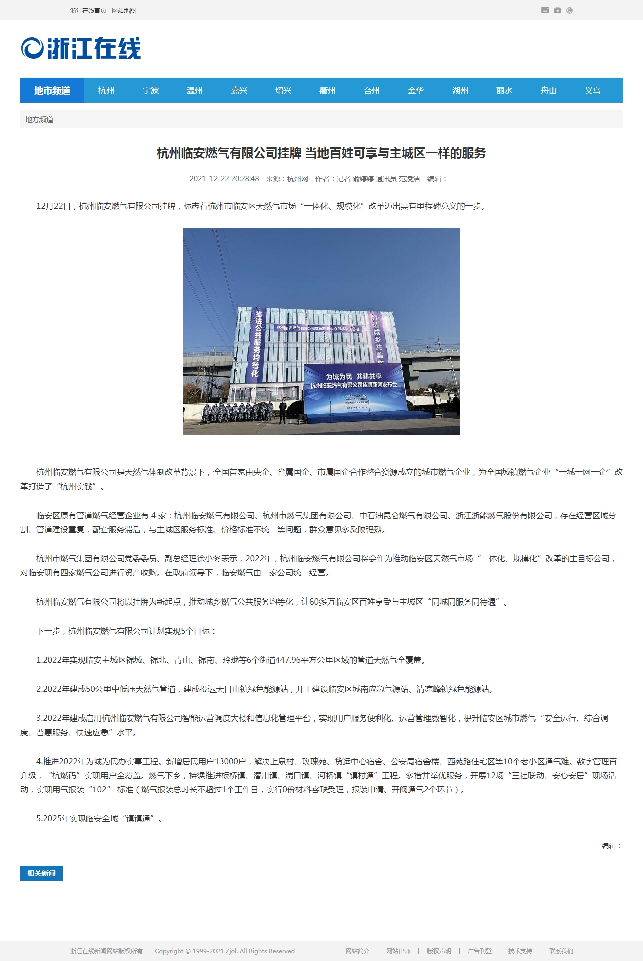12月22日,杭州临安燃气有限公司挂牌,标志着杭州市临安区天然气市场“一体化、规模化”改革迈出具有里程碑意义的一步。