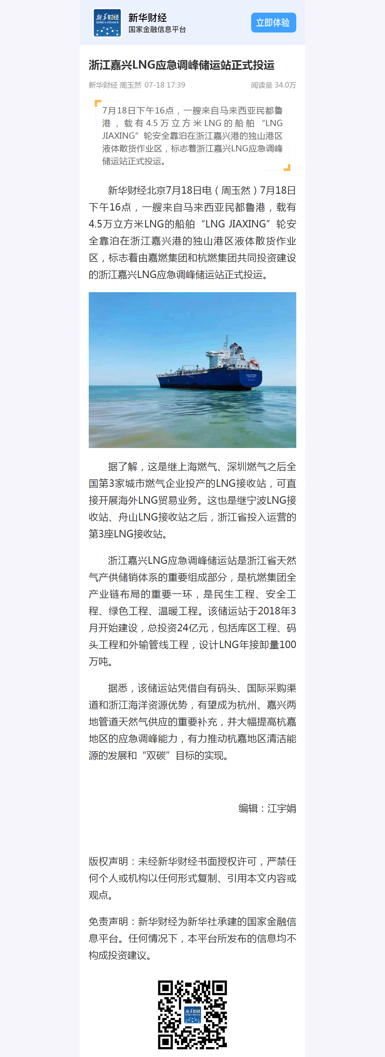 据悉,该储运站凭借自有码头、国际采购渠道和浙江海洋资源优势,有望成为杭州、嘉兴两地管道天然气供应的重要补充,并大幅提高杭嘉地区的应急调峰能力,有力推动杭嘉地区清洁能源的发展和“双碳”目标的实现。