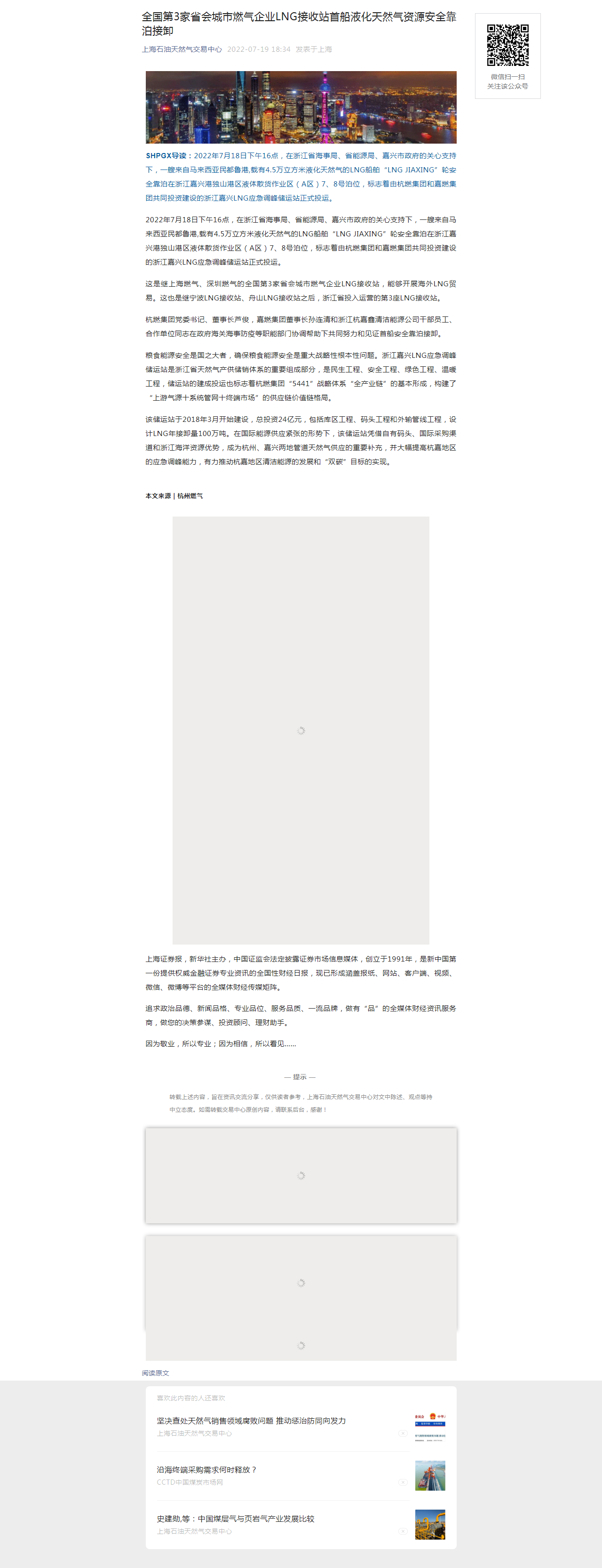 2022年7月18日下午16点,在浙江省海事局、省能源局、嘉兴市政府的关心支持下,一艘来自马来西亚民都鲁港,载有4.5万立方米液化天然气的LNG船舶“LNG JIAXING”轮安全靠泊在浙江嘉兴港独山港区液体散货作业区(A区)7、8号泊位,标志着由日本女优 和嘉燃集团共同投资建设的浙江嘉兴LNG应急调峰储运站正式投运。