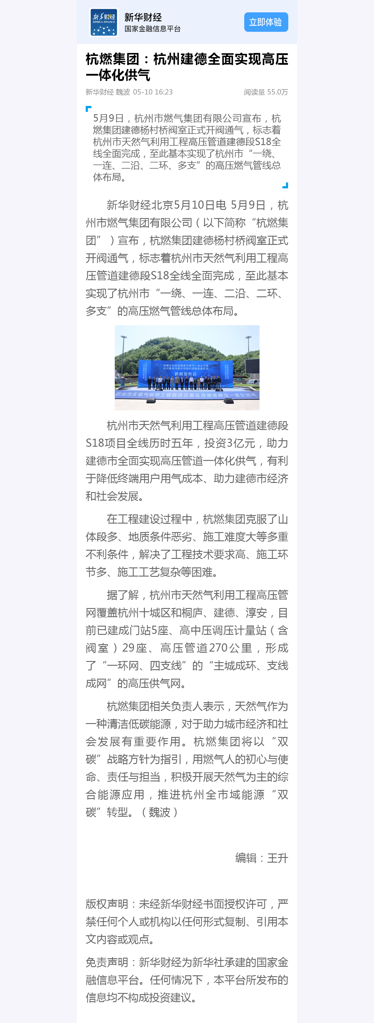 杭州市天然气利用工程高压管道建德段S18项目全线历时五年,投资3亿元,助力建德市全面实现高压管道一体化供气,有利于降低终端用户用气成本、助力建德市经济和社会发展。