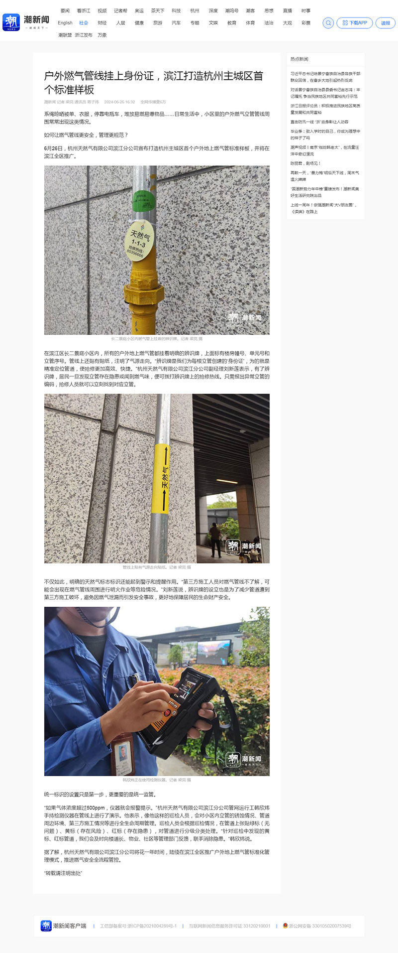 6月26日,杭州天然气有限公司滨江分公司宣布打造杭州主城区首个户外地上燃气管标准样板,并将在滨江全区推广。