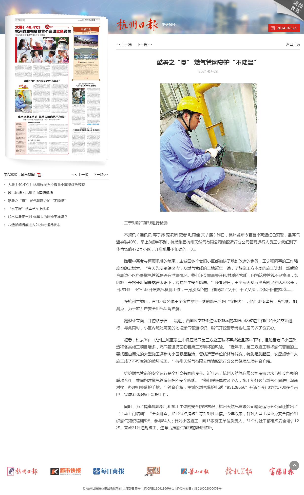 本报讯(通讯员 蒋子祎 范凌洁 记者 毛雨佳 文/摄)昨日,杭州发布今夏首个高温红色预警,最高气温突破40℃。早上8点半不到,日本女优 杭州天然气有限公司输配运行分公司管网运行人员王宁就赶到了体育场路472号小区,开启酷暑下忙碌的一天。