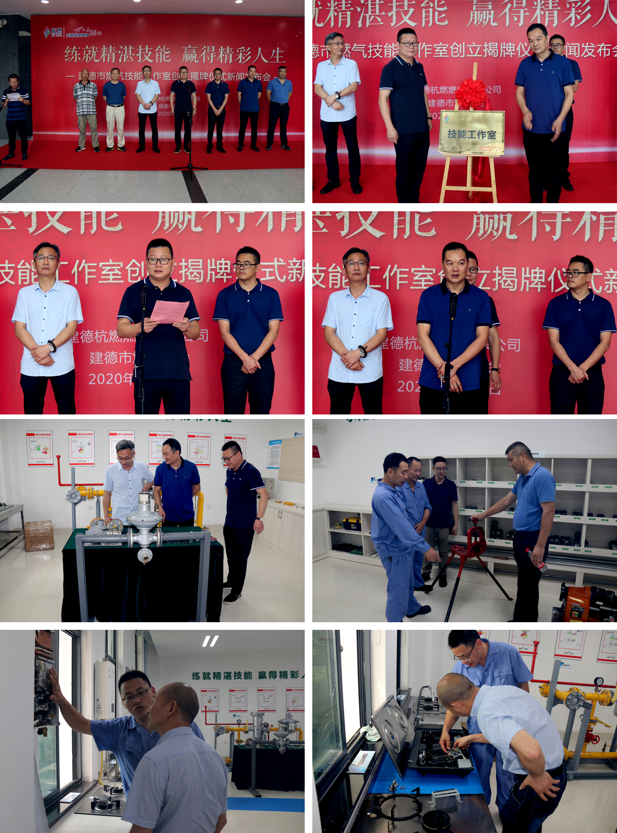 公司总经理和燃气协会会长一同为建德市燃气技能工作室揭牌。仪式结束后,参会领导一行在总经理方国华的邀请下移步至技能工作室参观、指导。杭燃工匠代表王云为工作室成员现场教学。