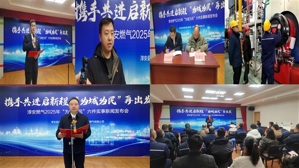 淳安公司支部书记、董事长丁立飞作新闻发布,宣布2025年“为城为民”六件实事。今年,淳安县住房和城乡建设局机关党支部与淳安杭燃党支部首次党建联建,携手推出六件实事,围绕“为城为民”服务宗旨,深化政企合作:联合开展安全检查和服务,推进胶管“清零”;改造老旧小区,消除安全隐患;持续落实非居民用户同城同价,减轻用户用气成本;对小区低压管网开展精细化“体检”,运用科技手段保障老旧小区管网安全;完善文昌镇、汾口镇管网成环成网,推动乡镇燃气服务均等化;创新推出小公建优惠套餐,释放管道燃气红利。这些举措助力淳安县山海协作和共同富裕,让群众共享发展成果。